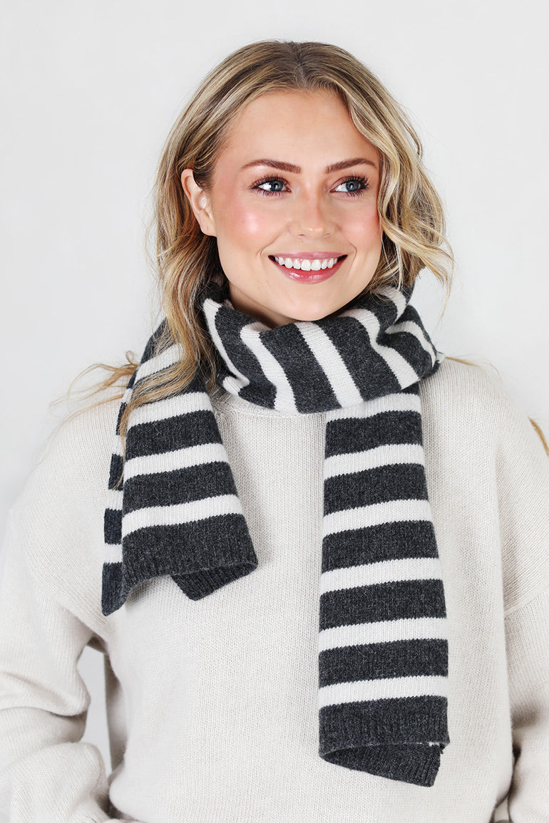 Deilig lammeullskjerf fra danske Gai + Lisva. Nydelig kvalitet og deilige fargekombinasjoner. Grå og offwhite striper.