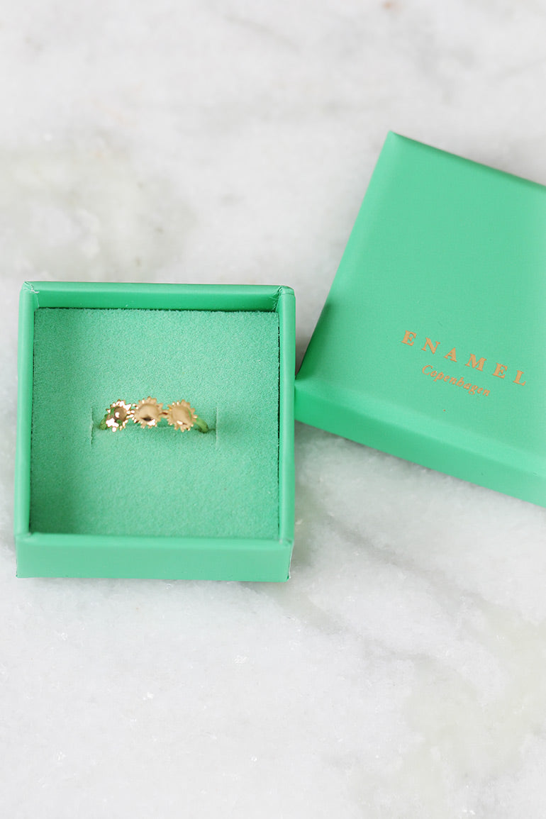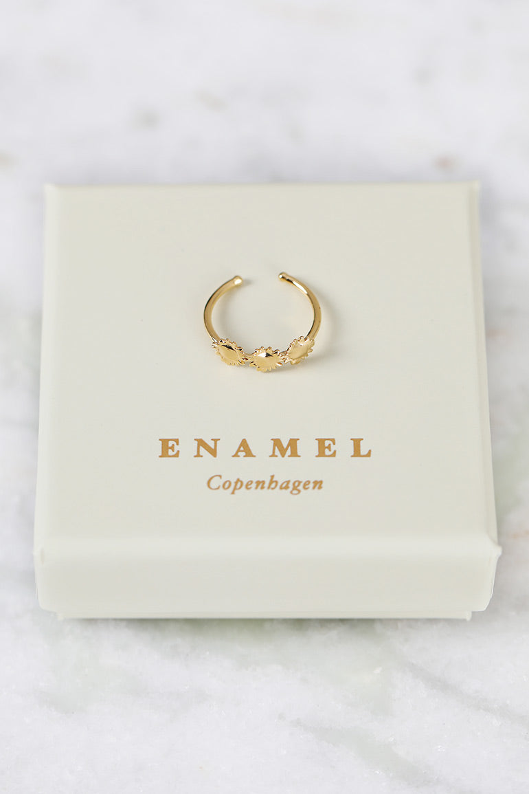 Skjønn ring fra Enamel Copenhagen i gull med justeringsmuligheter. Ringen består av tre solsikke-soler på rad, som vil vekke assosiasjoner til barndommens somre og nylagde blomsterkranser på en solfylt sommerdag.