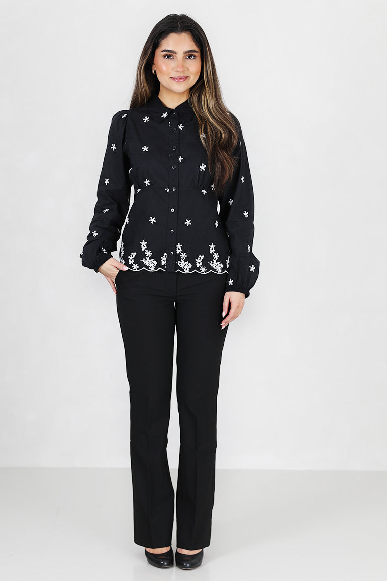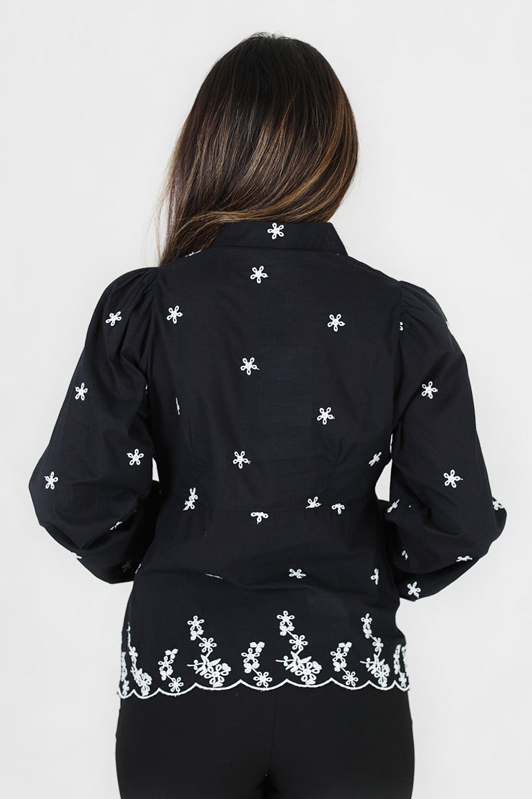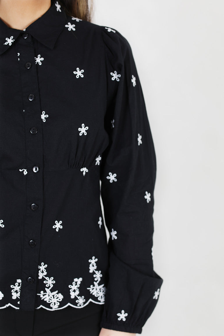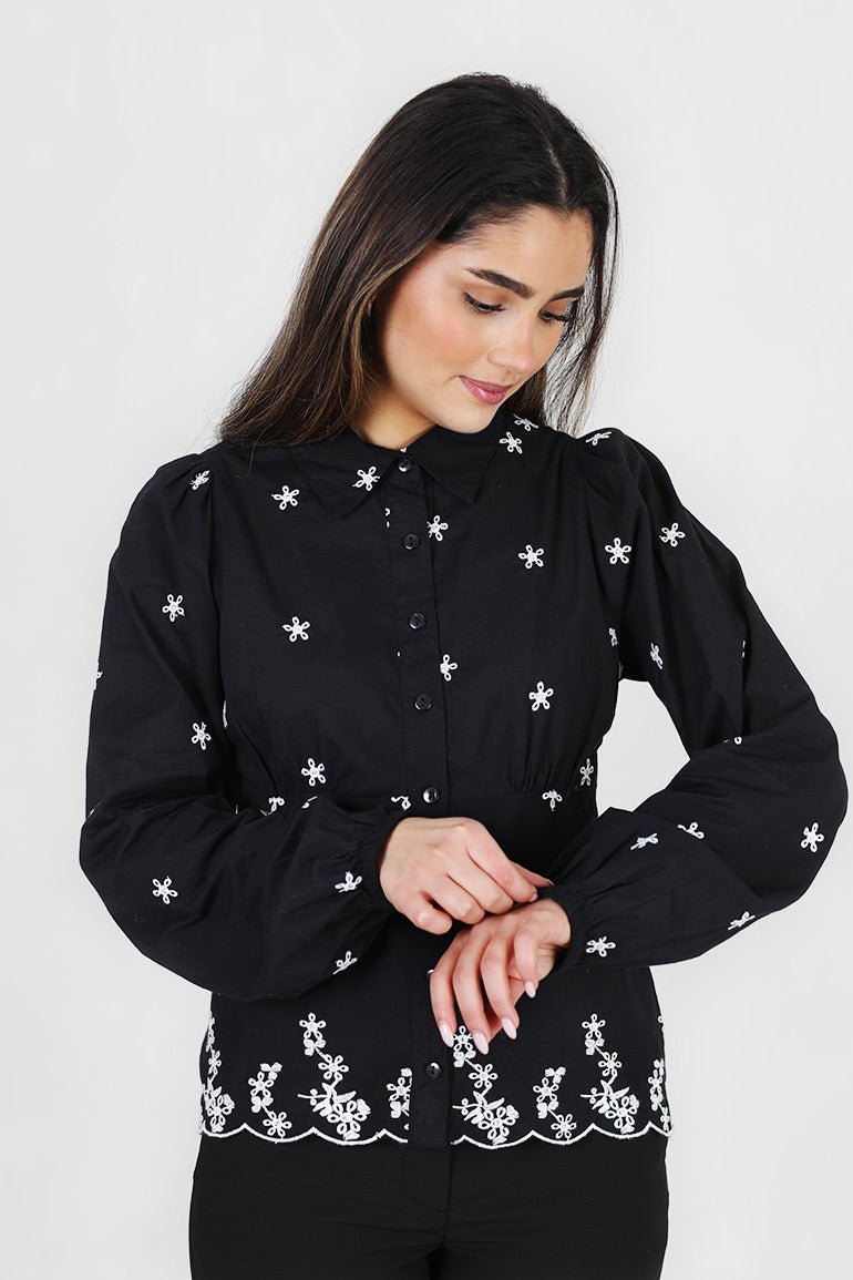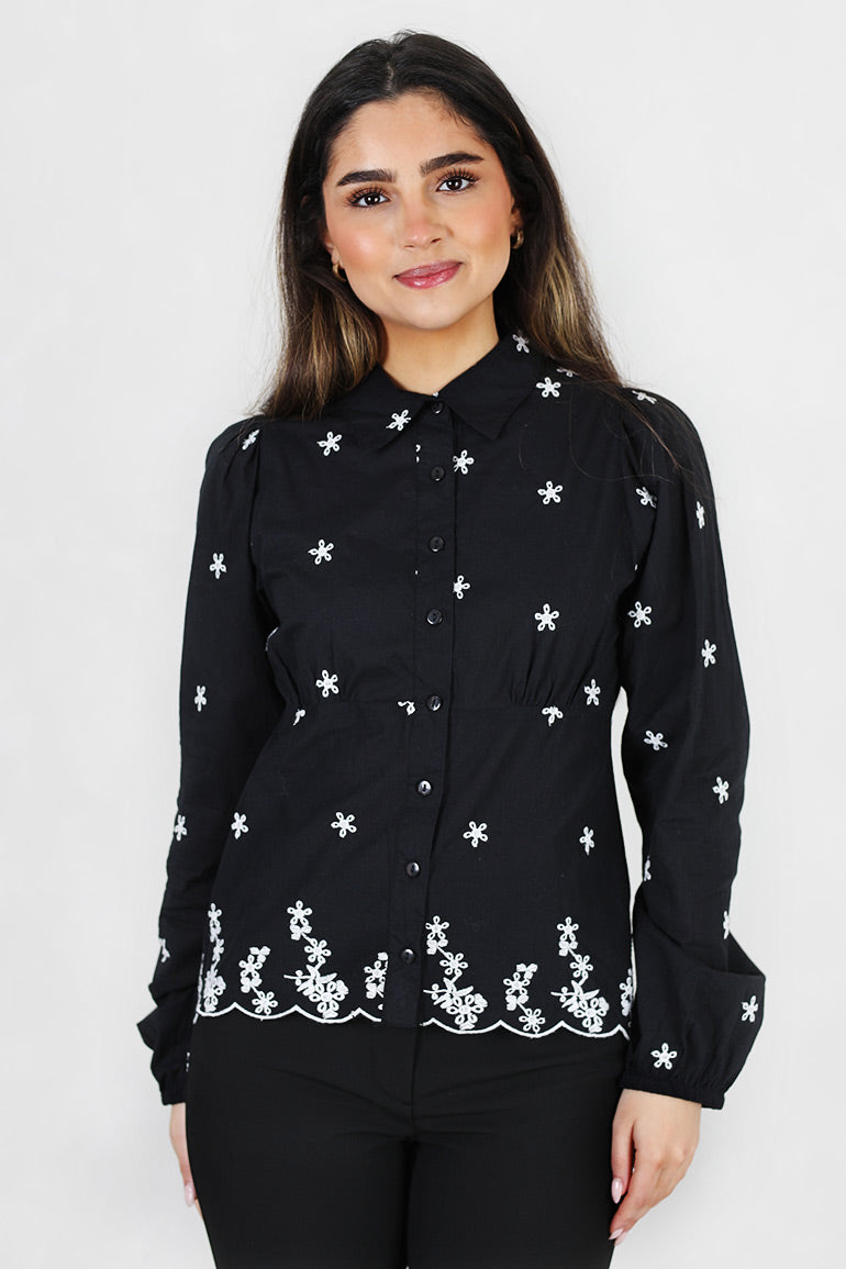 Skjønn bluse fra Missmaya i sort med hvite broderier. Klassisk, innsvingt skjorte modell med krage og knapper helt ned. Lange ermer med strikk.