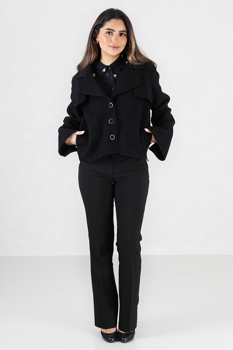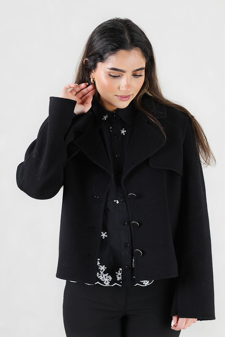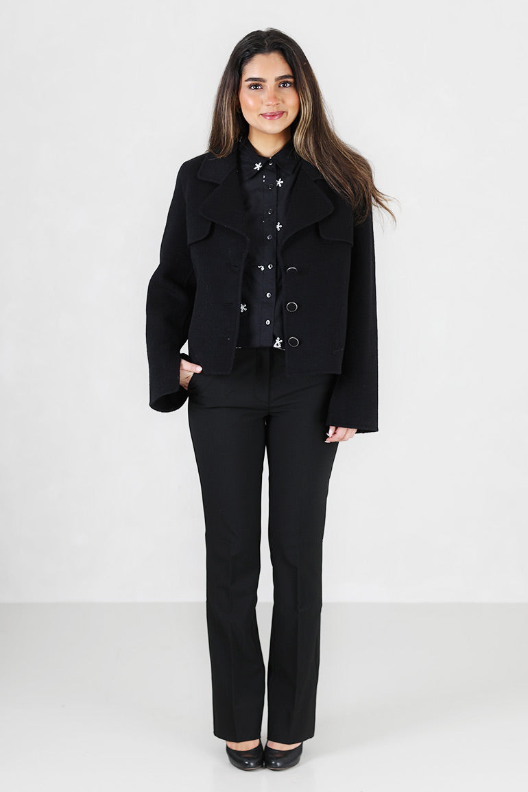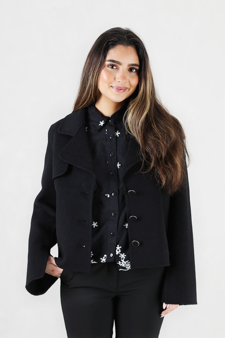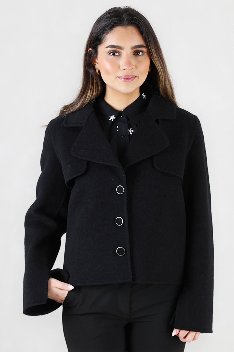Skjønn ytterjakke fra Ella & il i ull. Lange ermer, kort modell og fine knapper.