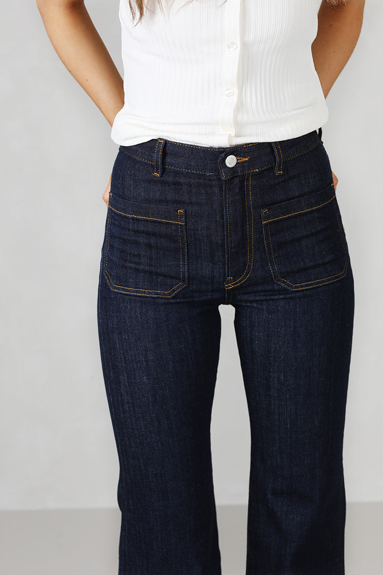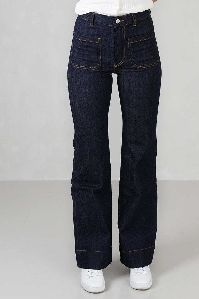 Den perfekte rådenim vasken i alltid populære St Monica jeansen fra våre svenske venner i Jeanerica. Mørkeblå med orange kontrastsømmer. Høyt liv, stretch og firkantede lommer foran og bak. Fin forsiktig sleng med bred kant.