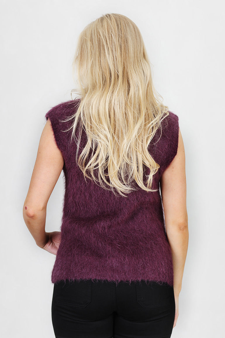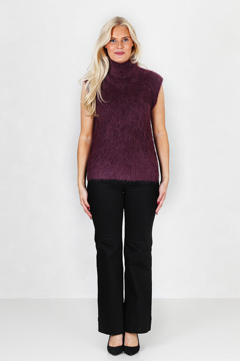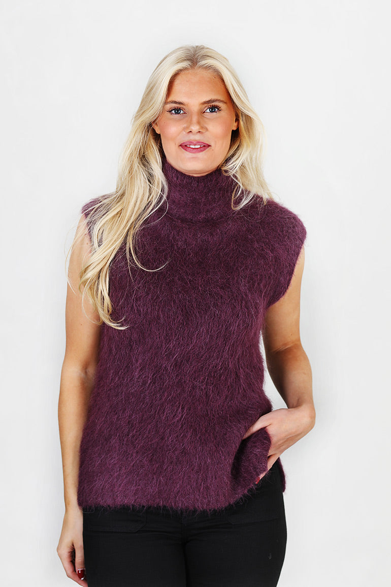 Deilig strikkevest fra byTiMo med høy hals. Helt utrolig vakker dyb burgunderfarge. Fin over en skjorte eller bare i seg selv som en topp. Splitt i siden.