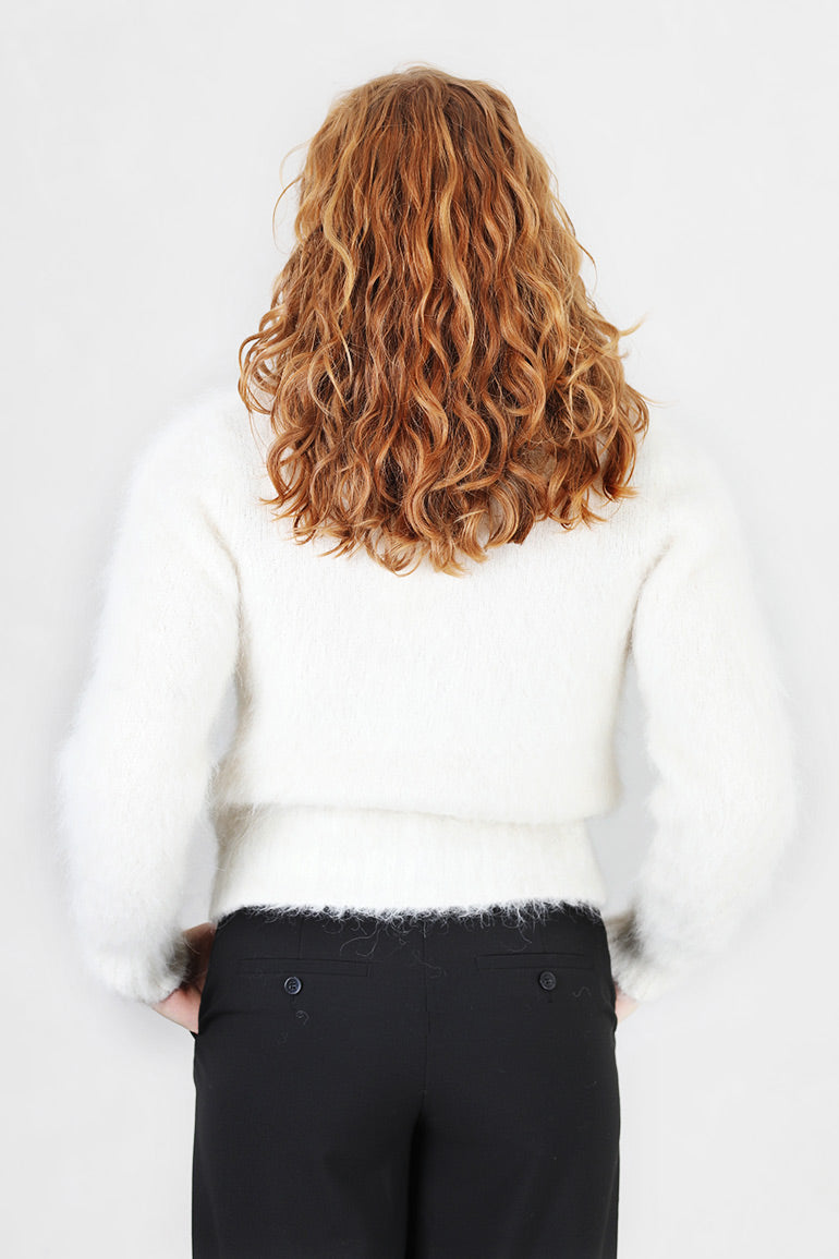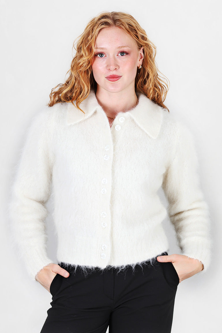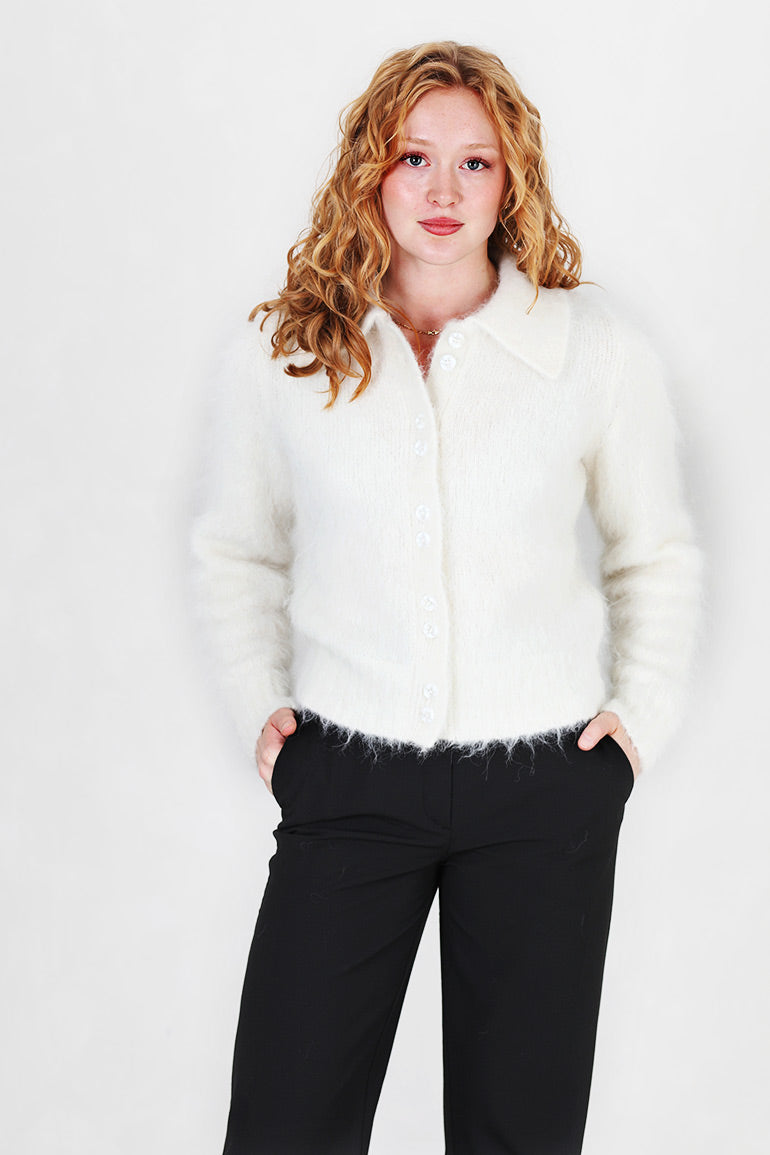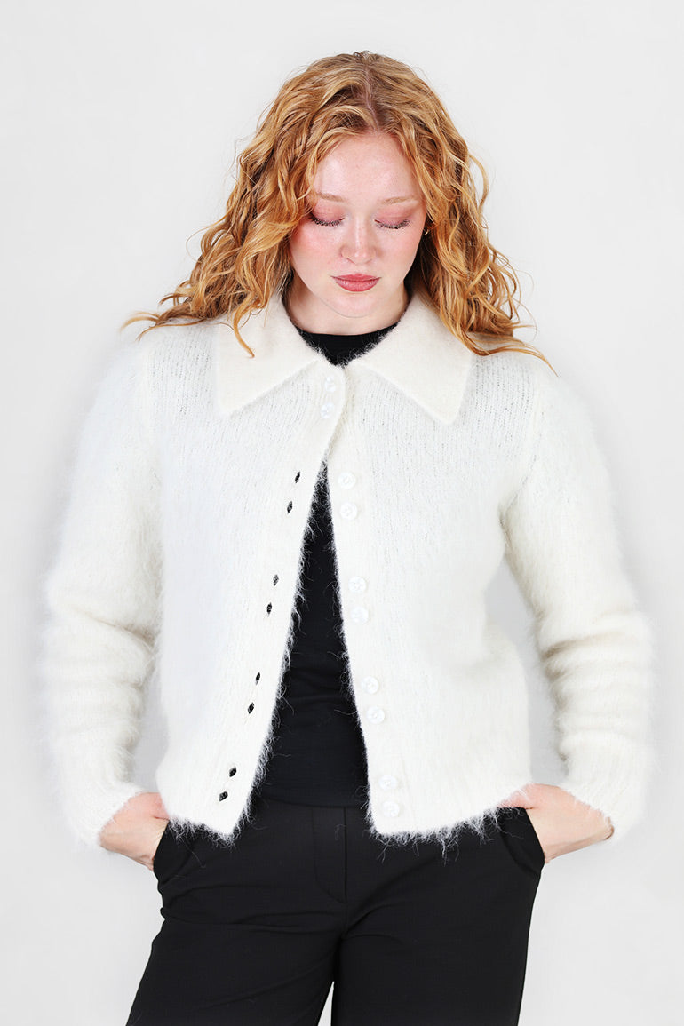 Skjønn strikket genser med krage fra byTiMo i offwhite. Knapper helt ned. Bruk den som en cardigan eller som en genser.