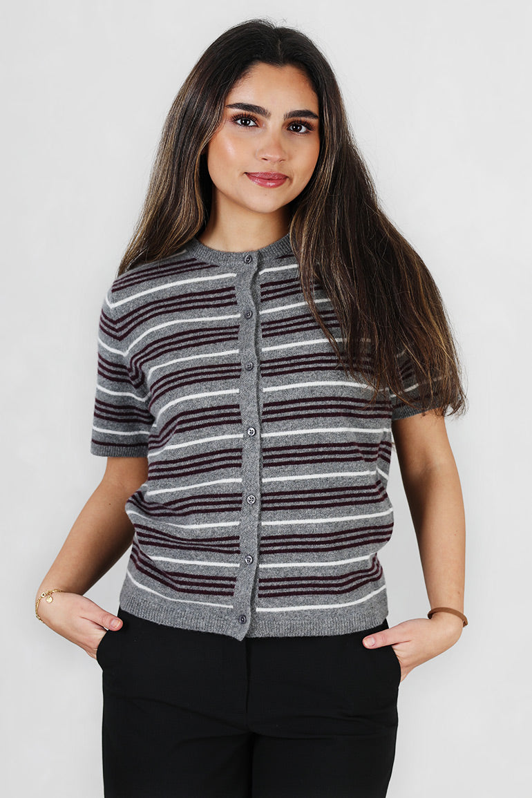 Skjønn cardigan med korte ermer fra norske Arnie Says. Rund hals, knapper helt ned. Grå, burgunder, hvite striper.