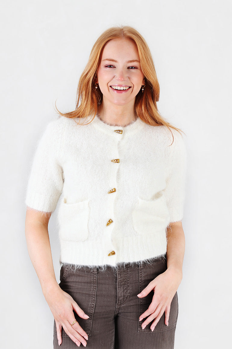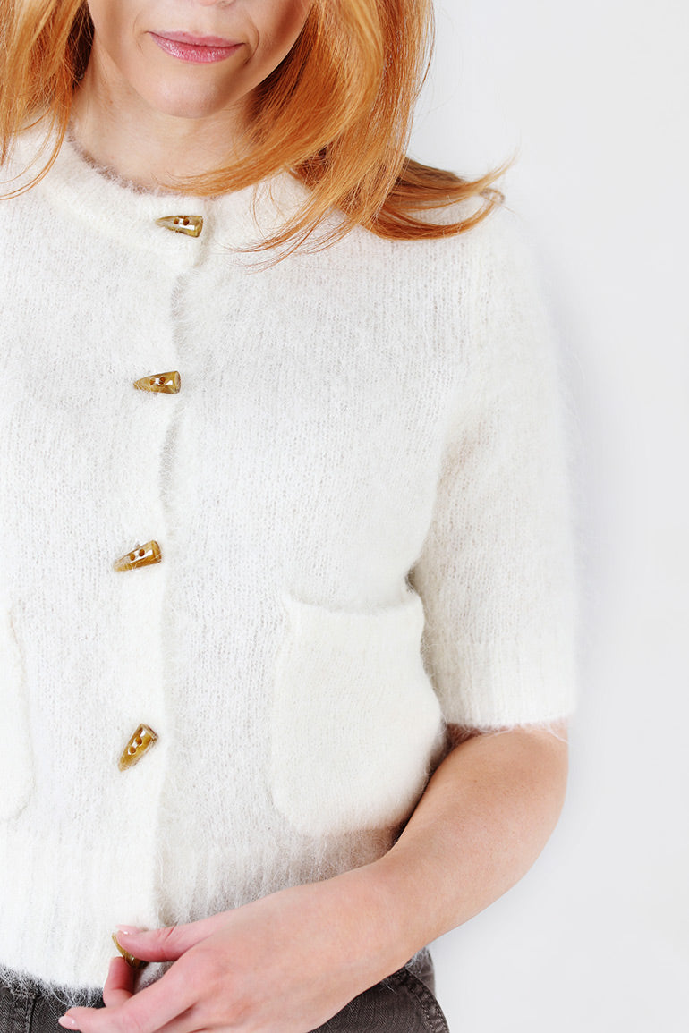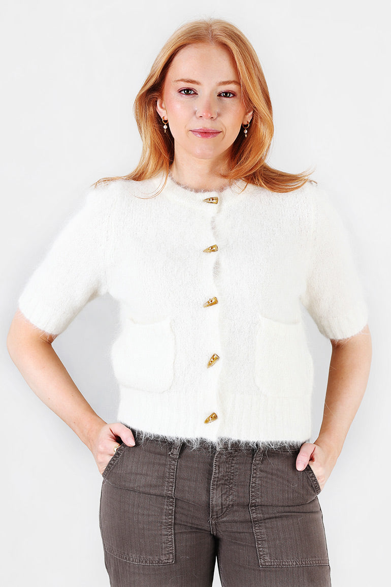 Skjønn cardigan fra danske Munthe. Korte ermer, fine "horn"knapper og nydelig offwhite farge.