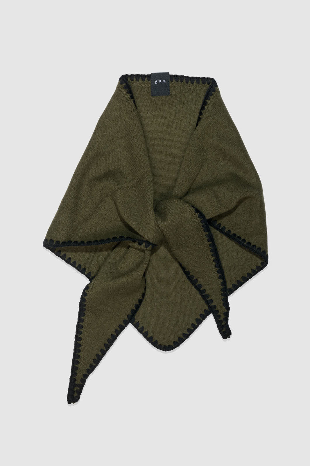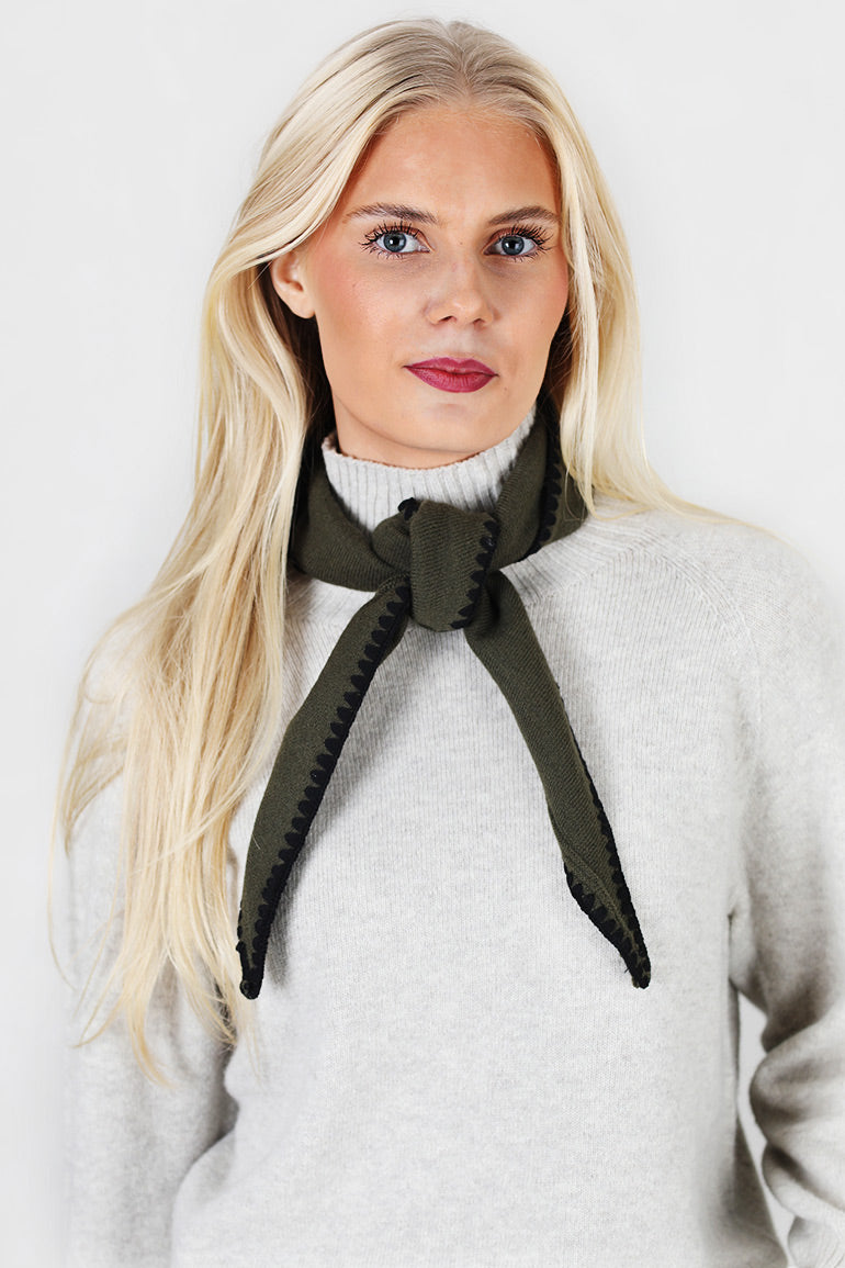 Superfint lite trekantskjerf fra Christian Aks med sorte sting i kanten. Style det inni en åpen skjortekrage eller bare som et lite skjerf, like fin ute eller inne.