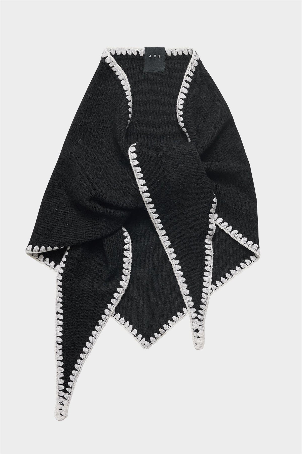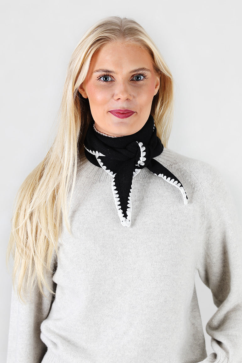 Superfint lite trekantskjerf fra Christian Aks med hvite kontrast sting i kantene. Style det inni en åpen skjortekrage eller bare som et lite skjerf, like fin ute eller inne.