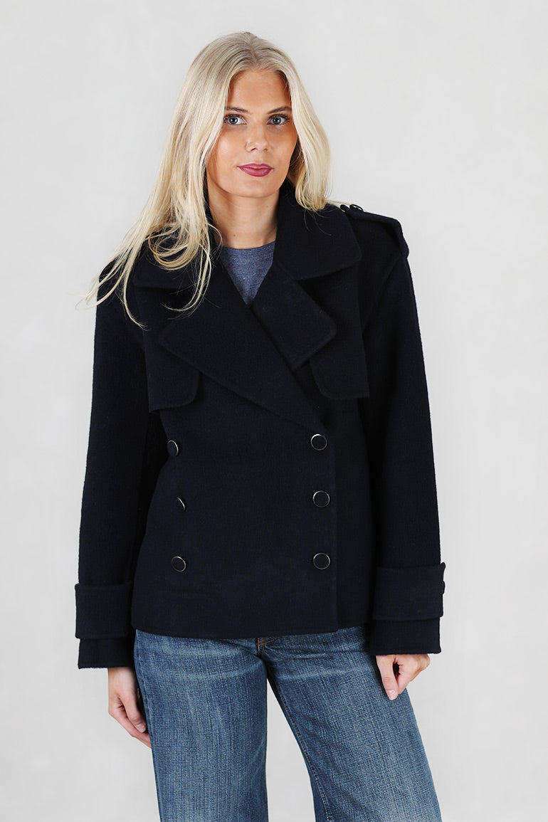 Ny ulljakke fra Ella & il i dyp mørkeblå farge og fantastisk kvalitet. Mange fine deltaljer som hemper på skuldre, legg bak og foran. Dobbeltspent. Belte i livet som kan tas av.