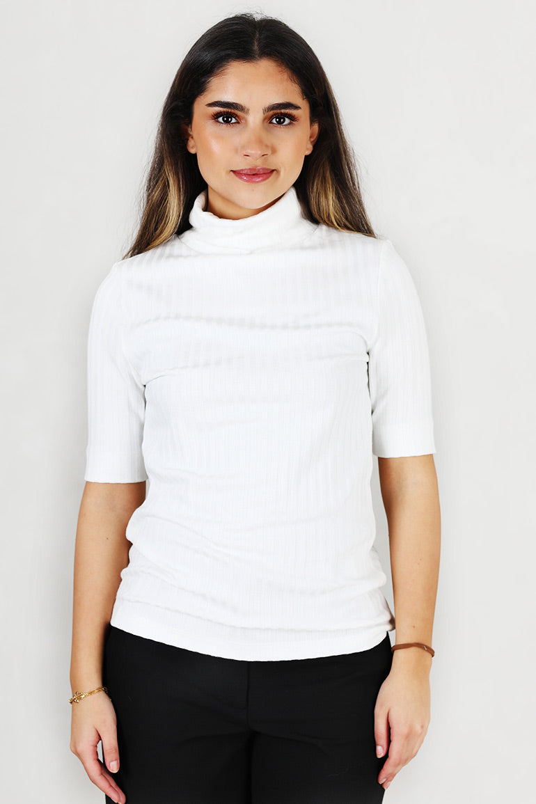 Pen høyhalset topp fra danske My essential wardrobe. Korte ermer, liten høy hals og smal modell. Fin, tykk ribbestrikk.