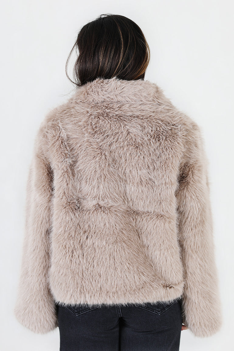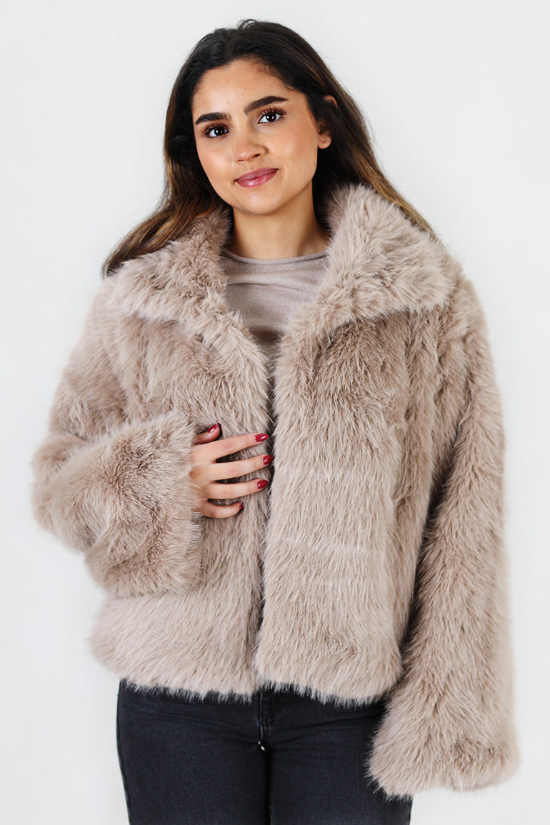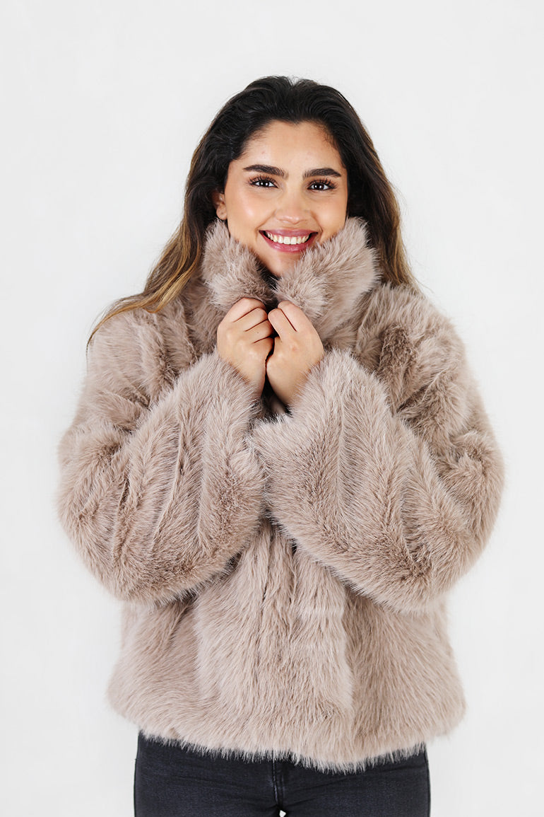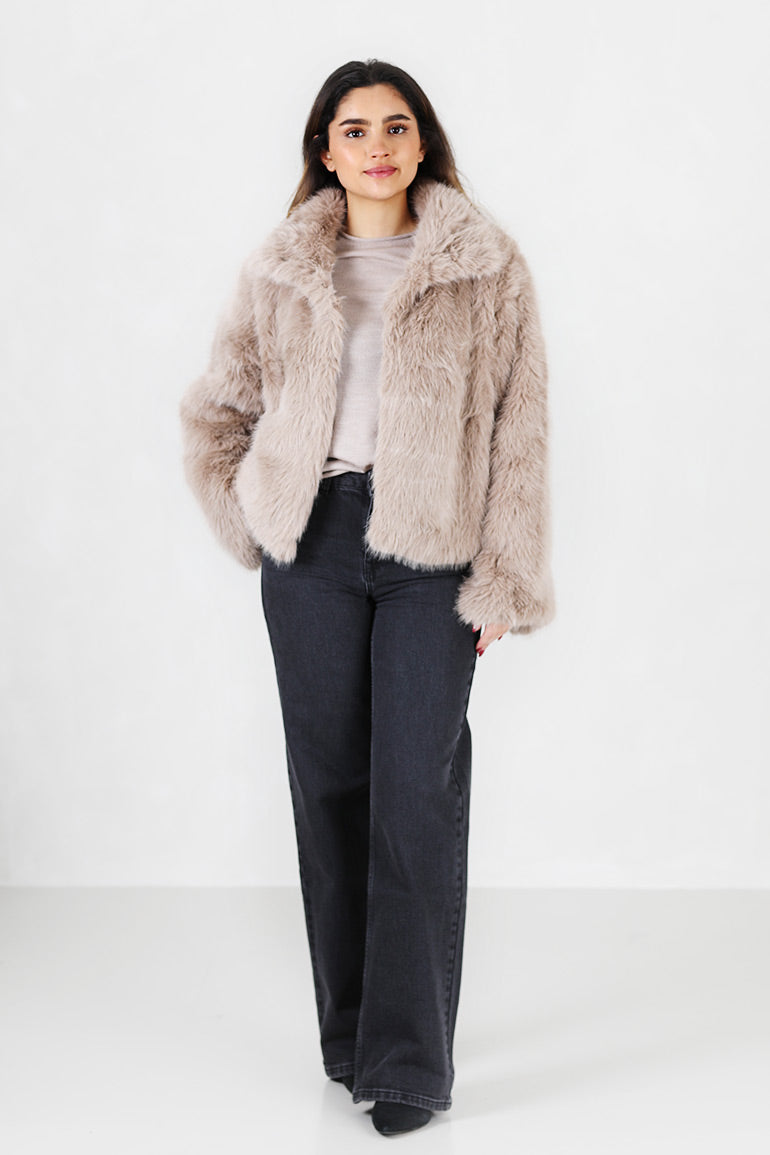 En helt utrolig flott fuskepels jakke fra My essential wardrobe. Nydelig gråbeige farge. Myk og deilig kvalitet med lange ermer med stor krage.