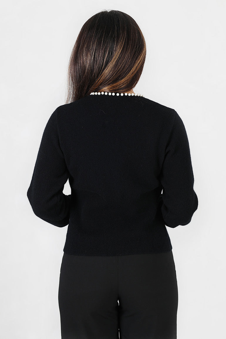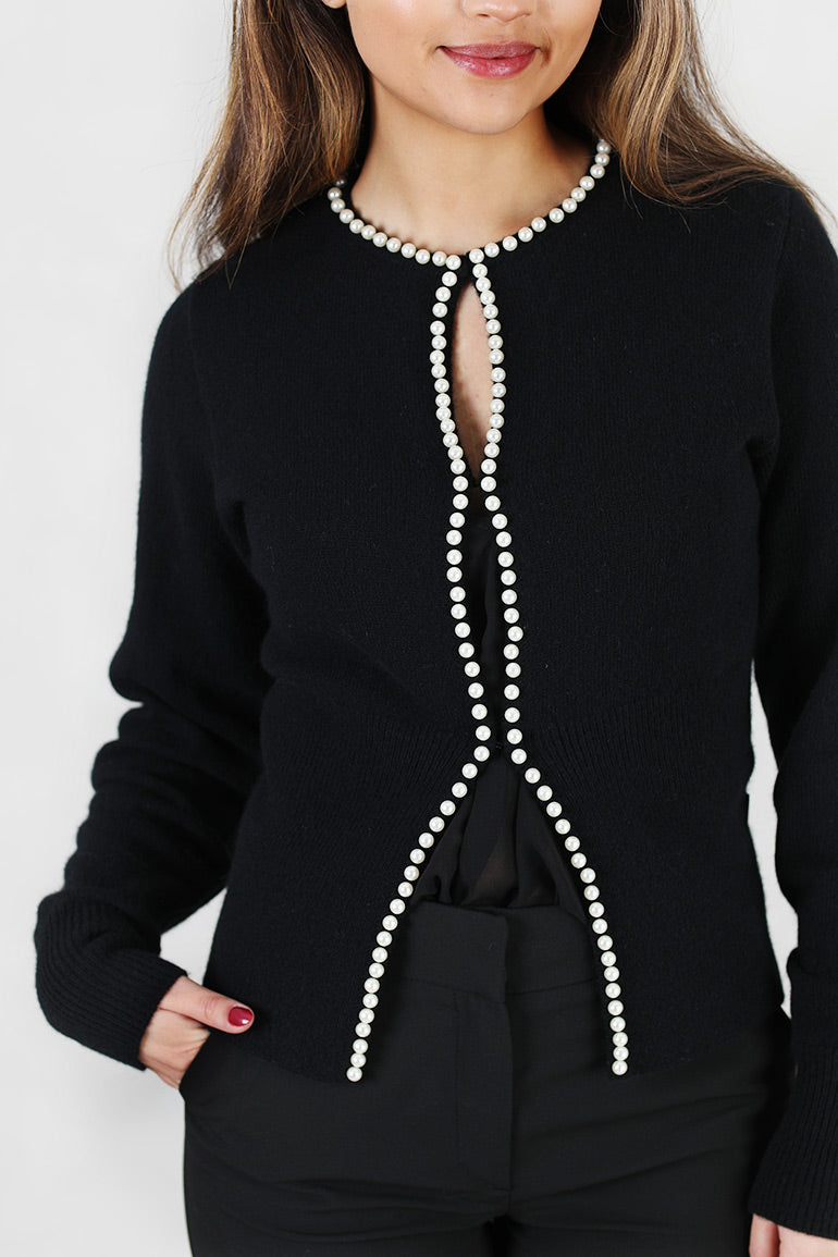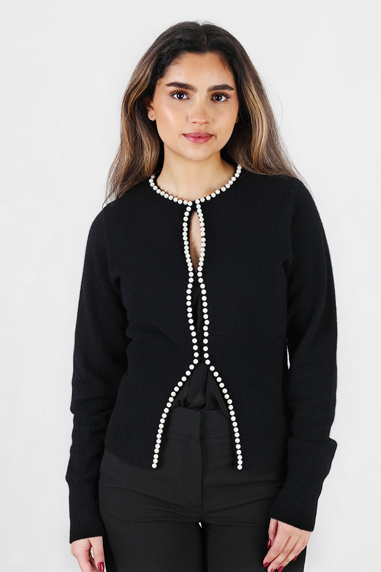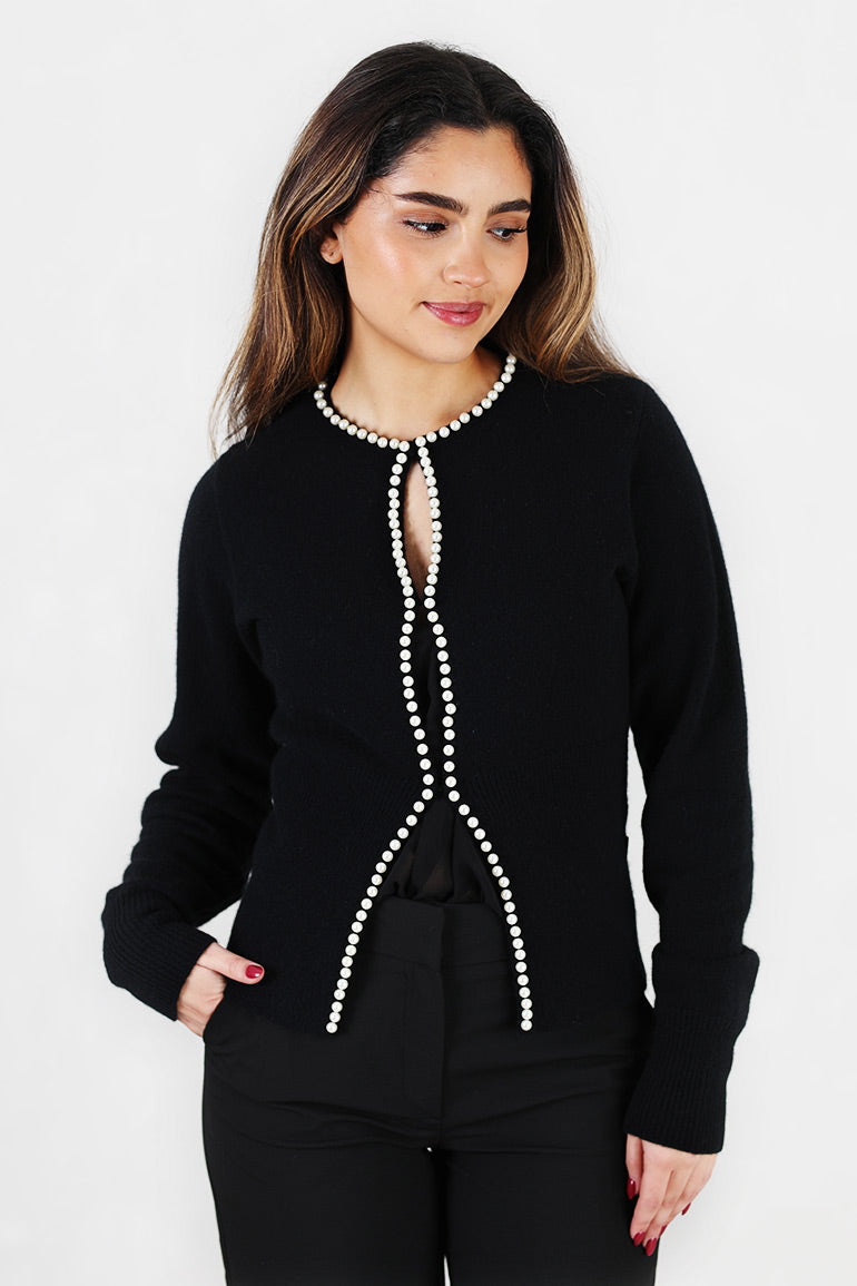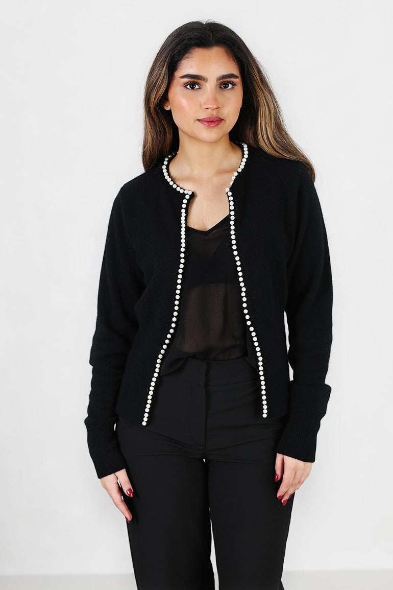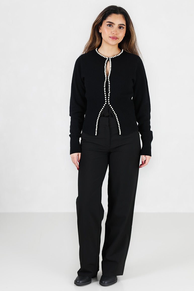 Nydelig cardigan fra Ella & il med perlekant. Smal modell med lange ermer og rund hals. Deilig og myk ullkvalitet. Lukkes med tre hemper foran.