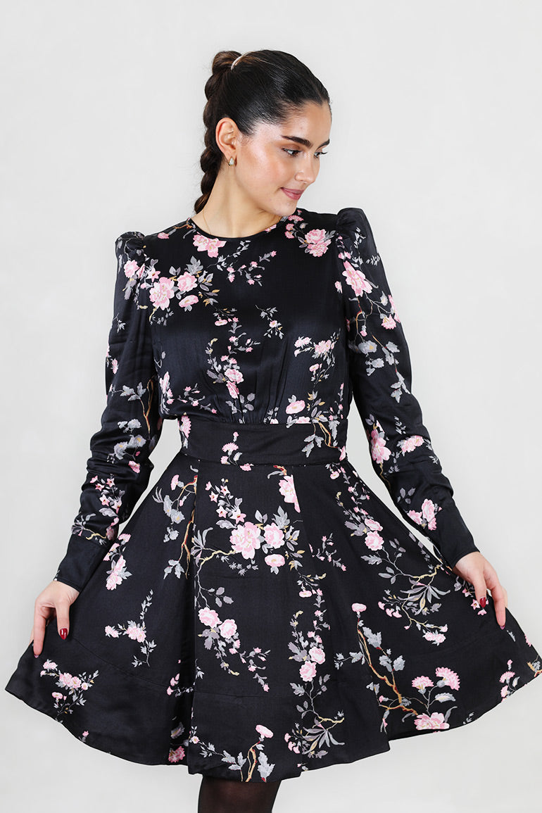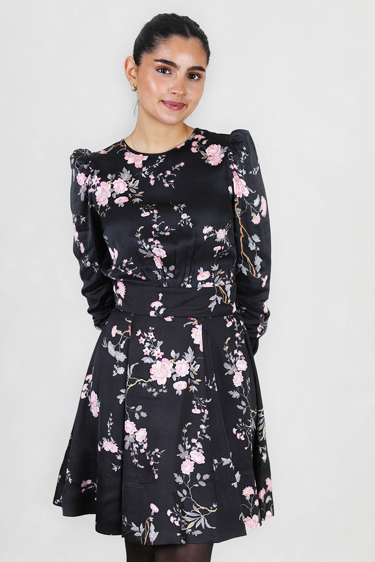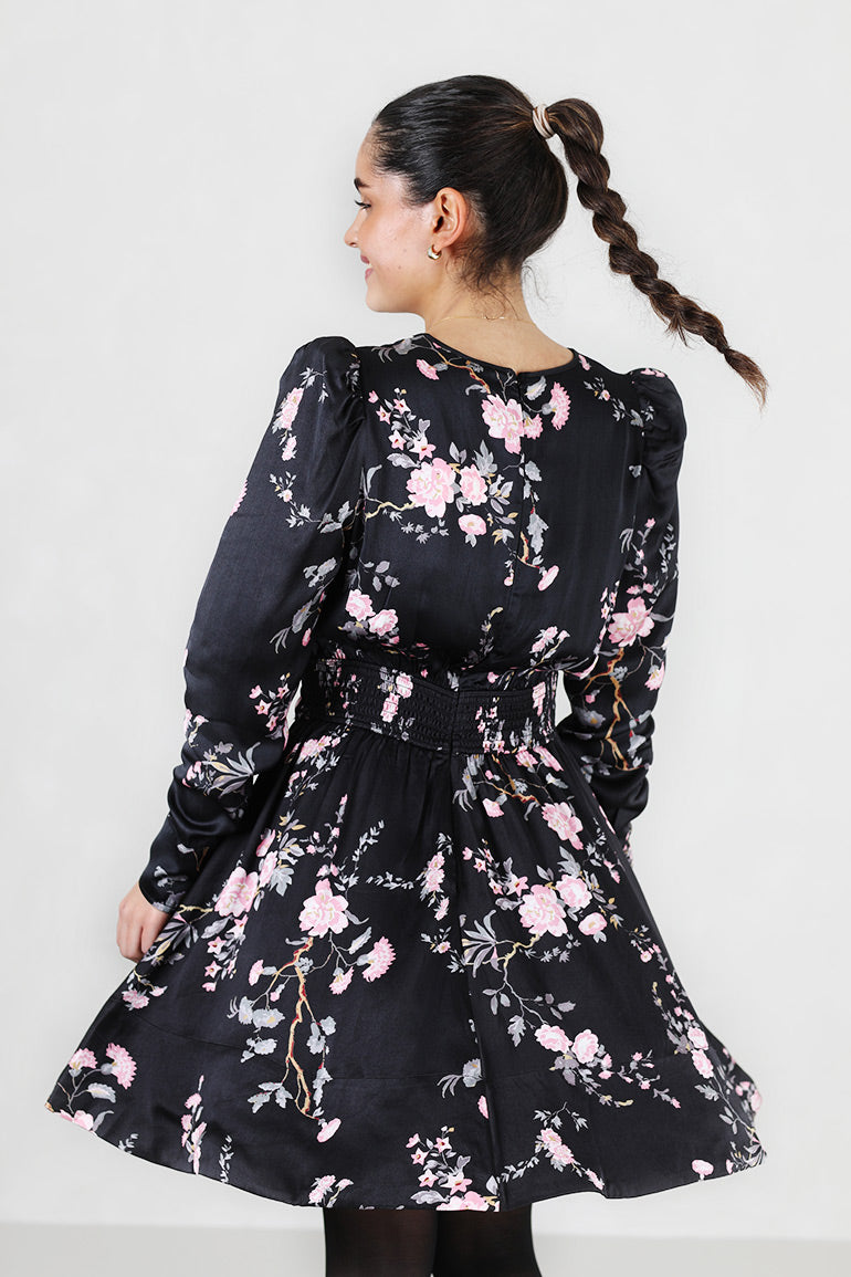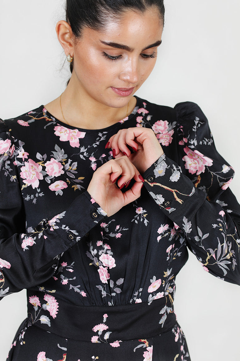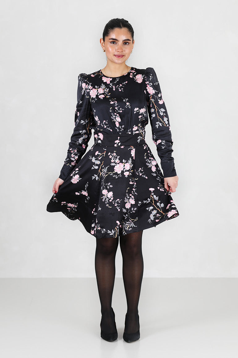 Vakker kjole fra byTiMo i sort sateng med rosa blomstermønster. Lange ermer, puffermer, rund hals og strikk i livet bak.