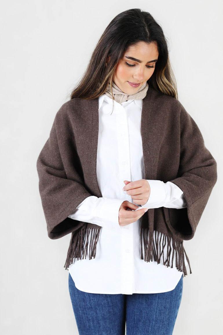 En kortere variant av den populære signaturjakken med frynser fra norske Christian Aks. I år har den kommet i den mest fantastiske sjokoladebrune fargen - høstens store trend! Like fin over en trøye, skjorte eller kjole. Fin som en overgangsjakke, men også superfin som en dressjakke inne.
