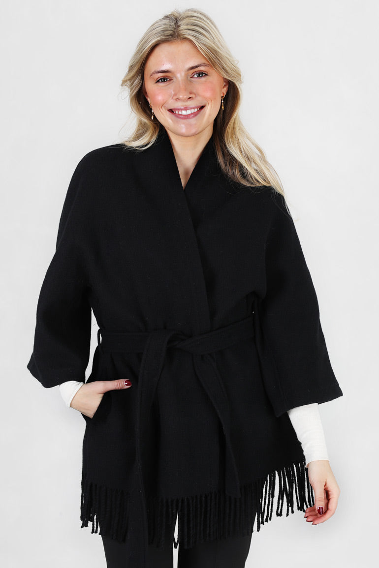 Signarurjakken til Christian Aks i klassisk sort! Lommer i sidene, løst knytebelte i livet og frynsekant nederst. Romslig modell.
