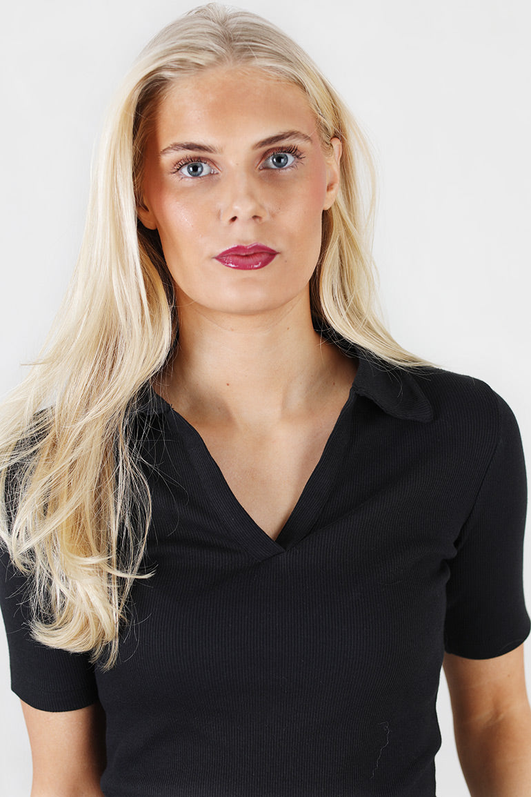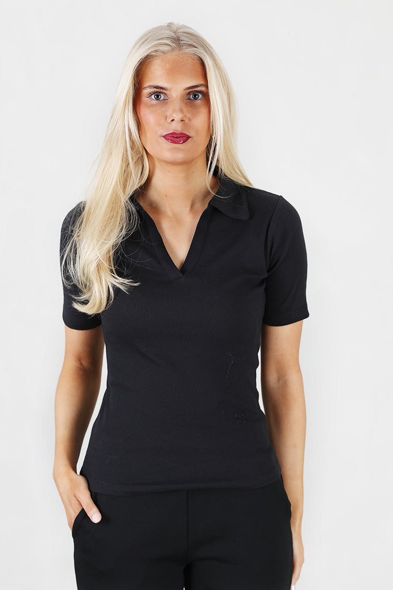 Superfin t-shirt med krage og v-hals fra My essential wardrobe i sort. Korte ermer, fin ribbestrikk i deilig bomull.