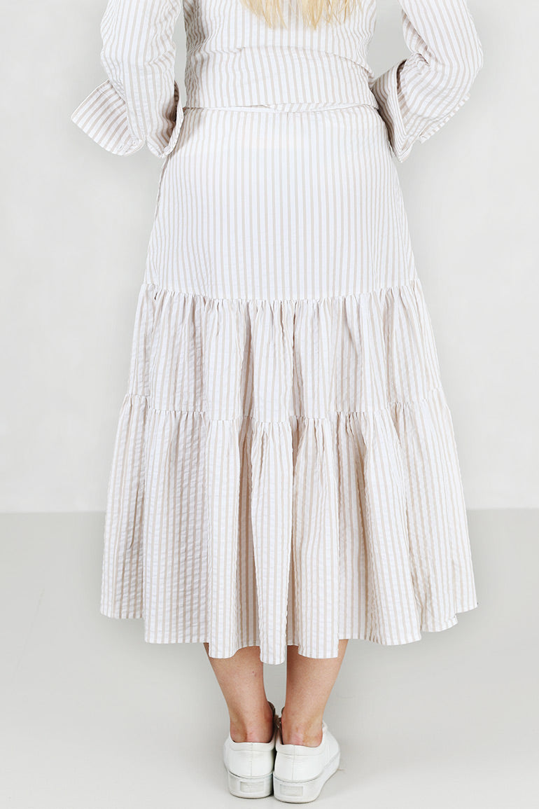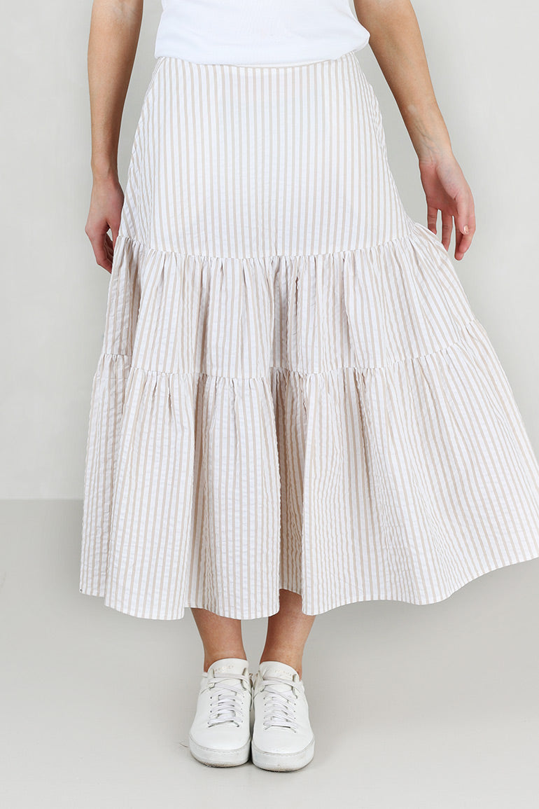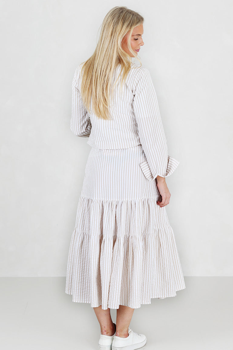 Midi skjørt fra byTiMo i deilig kreppkvalitet. Hvit bunn med beige striper. Lommer i sidene.