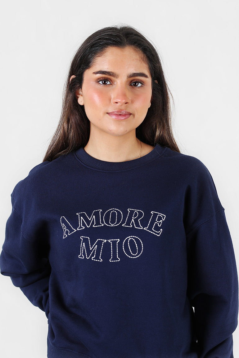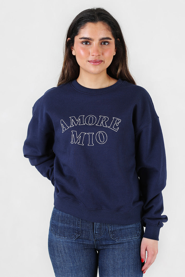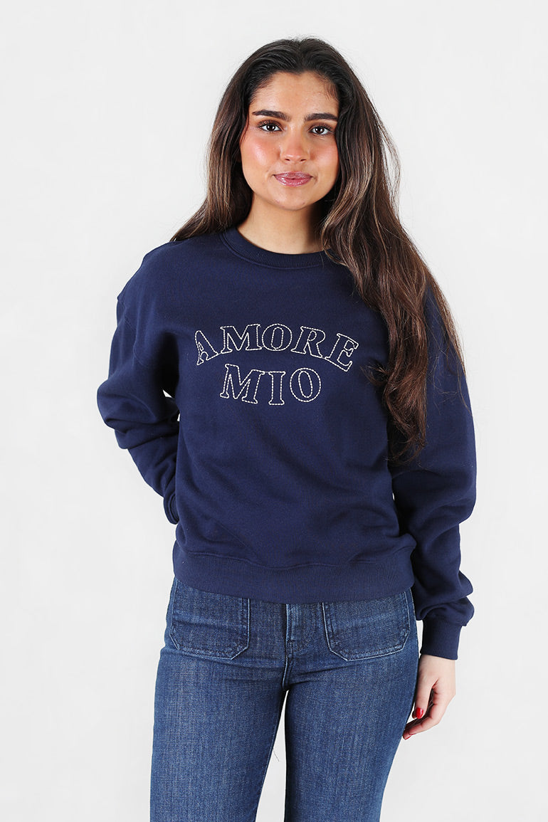 Deilig sweat genser fra franske Grace & Mila i mørke blå med teksten "Amore mio". Rund hals, lange ermer og strikk kant nederst.