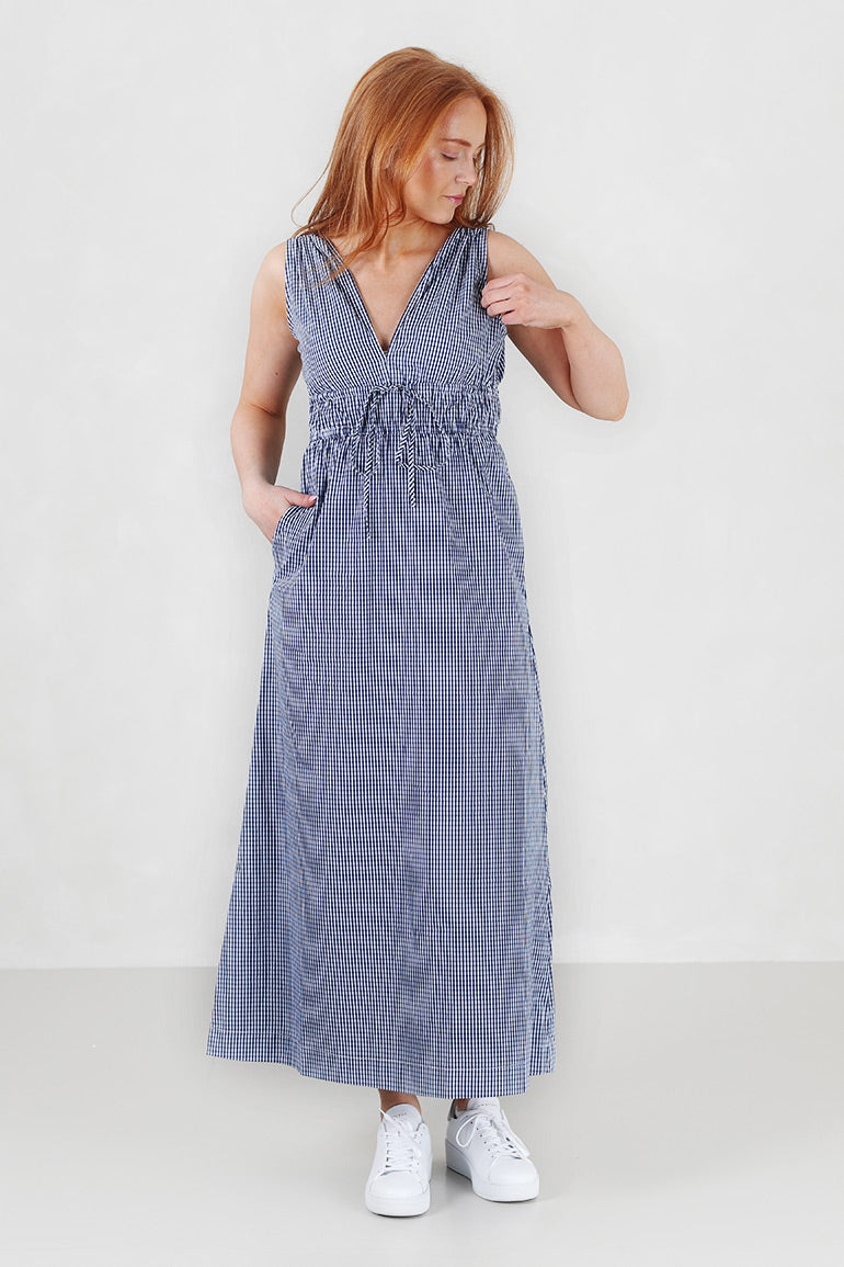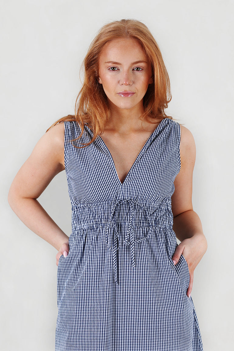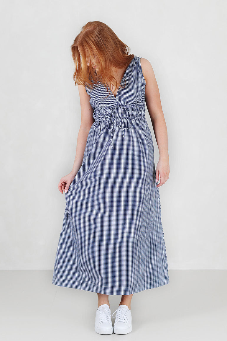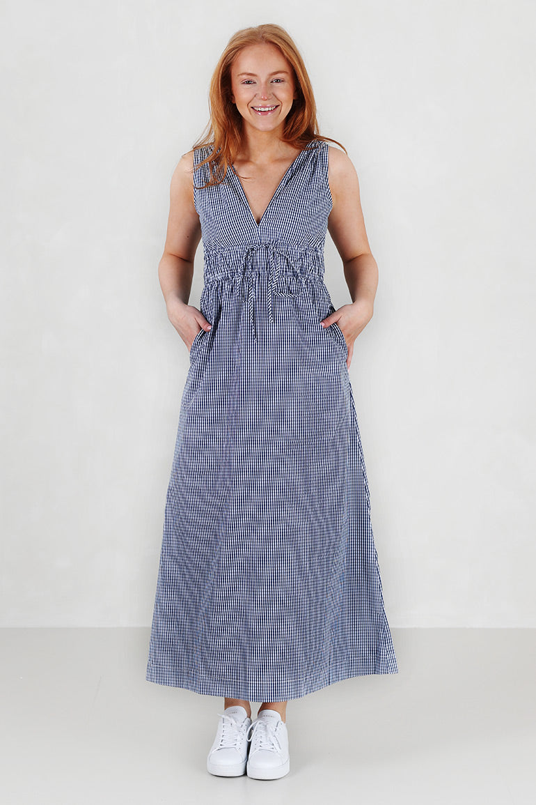 Skjønn kjole fra franske Grace & Mila i mørkeblå/hvite ruter. Tykke stropper, knyting under brystet og v-utrigning foran og bak. Lommer i sidene.