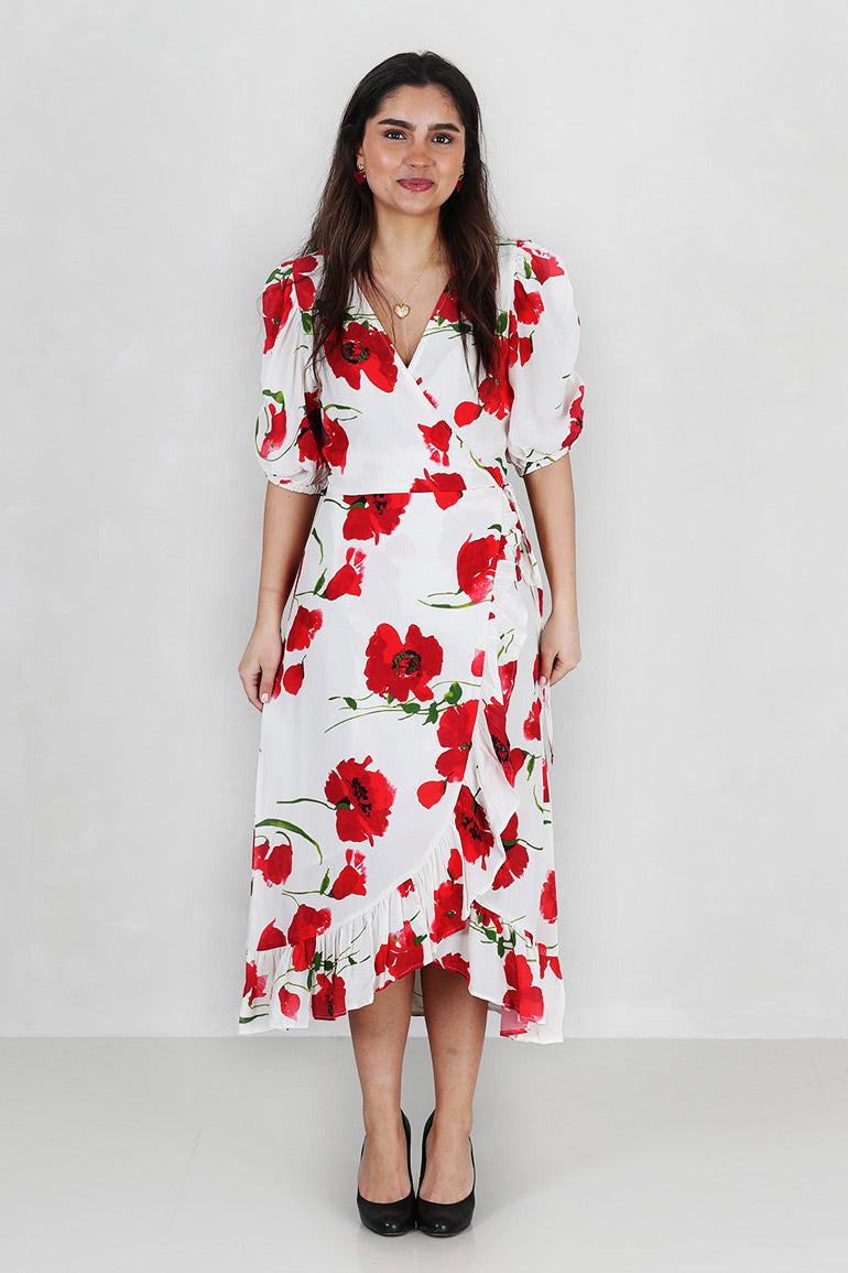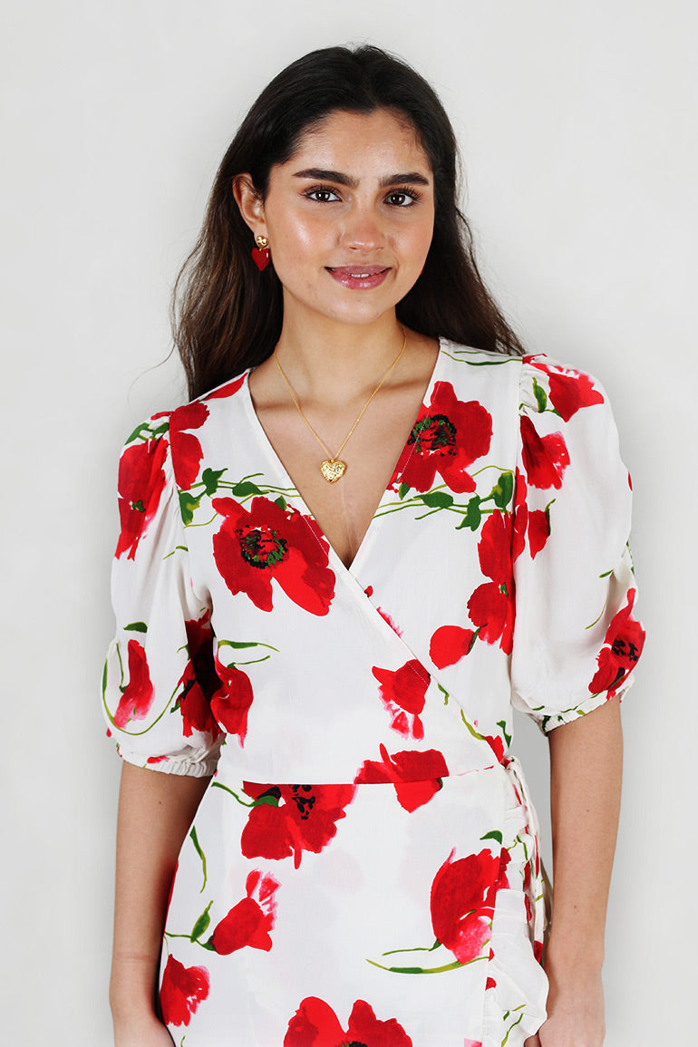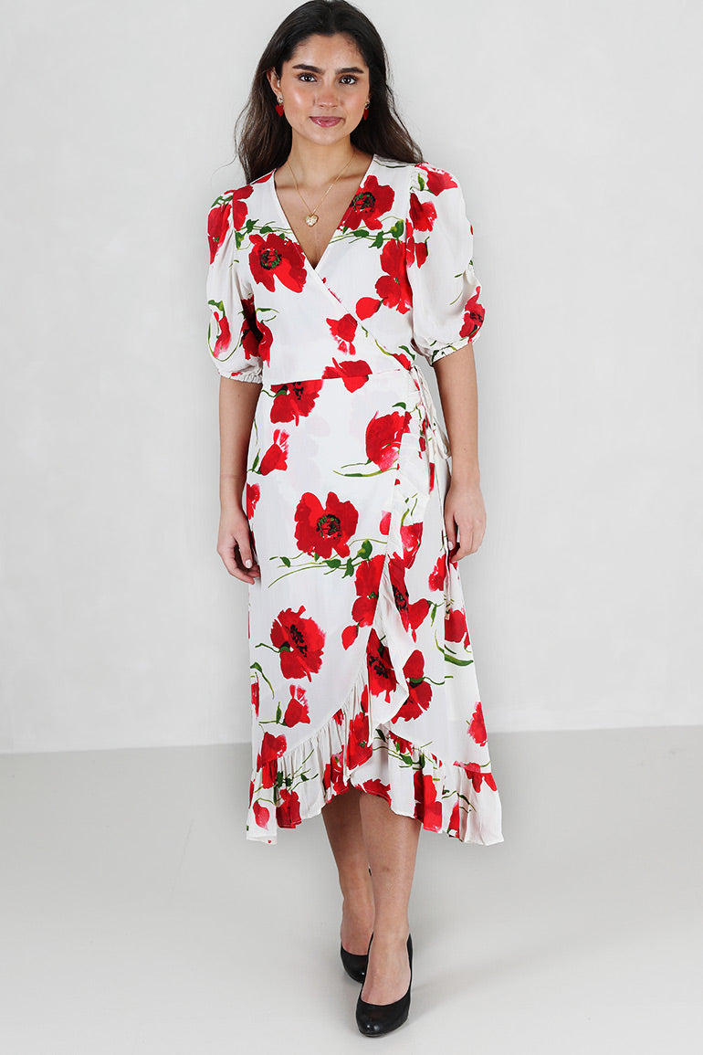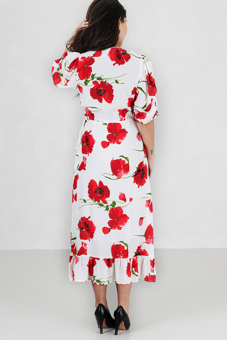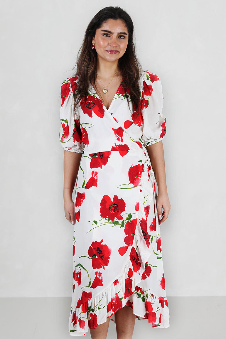 Skjønn omslagskjole fra Missmaya med rødt blomsterprint. Like fresh til heler som til sandaler eller joggesko. Korte ermer, v hals og midi lengde.