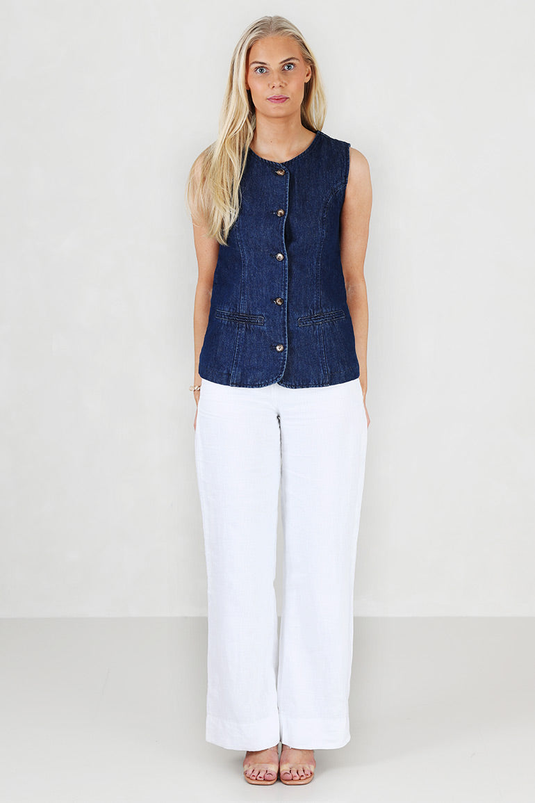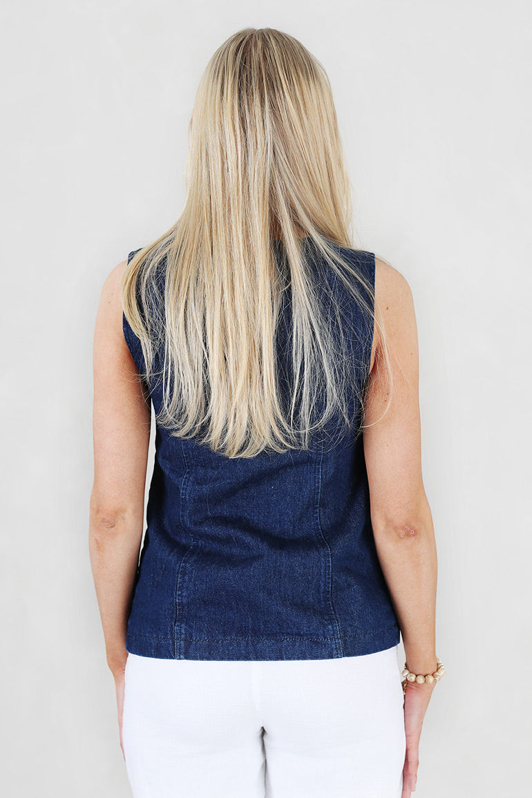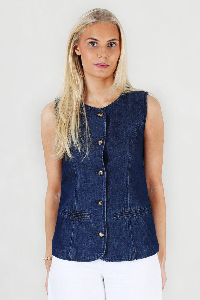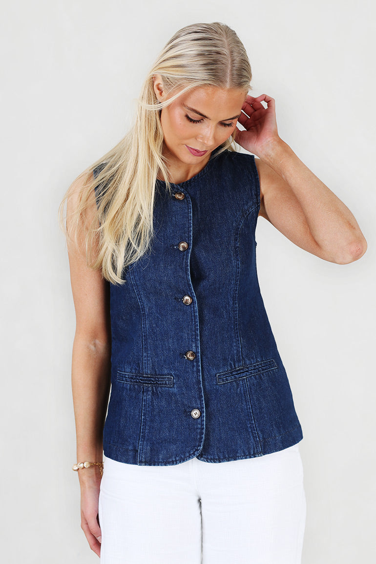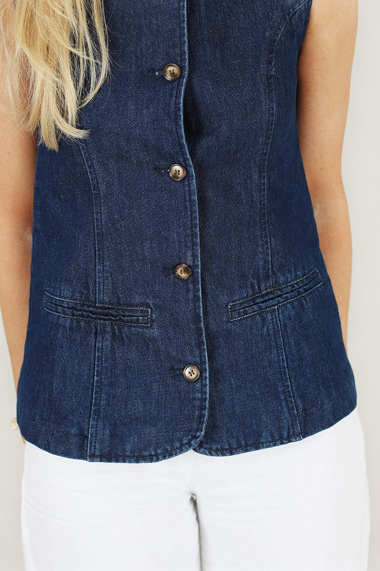 Superfin denimvest fra franske Grace & Mila i mørkeblå. Rund hals, knapper helt ned, tykke stropper.