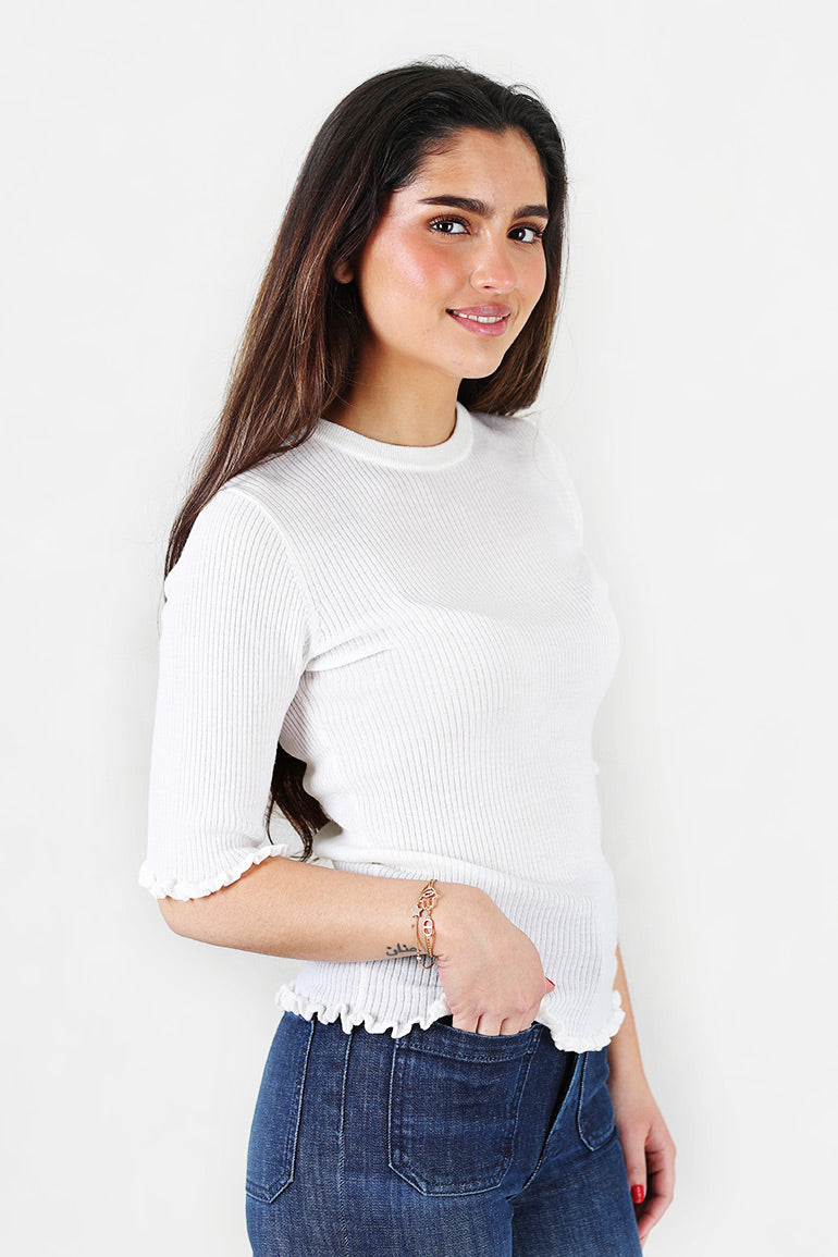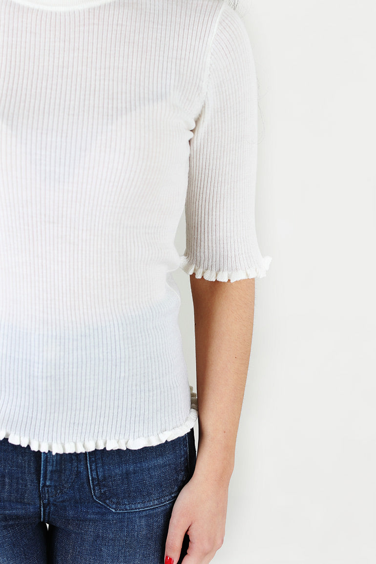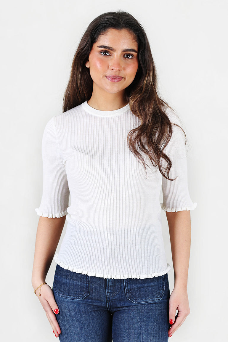 Nydelig, tynn, supermyk strikk fra Christian Aks. Korte ermer med volanger i kantene og rund hals. Ribbestrikk. Kommer i sort og i offwhite.
