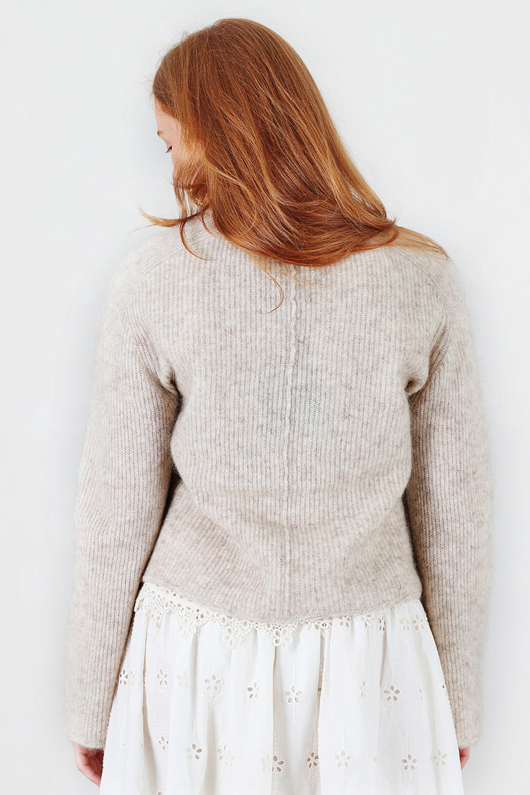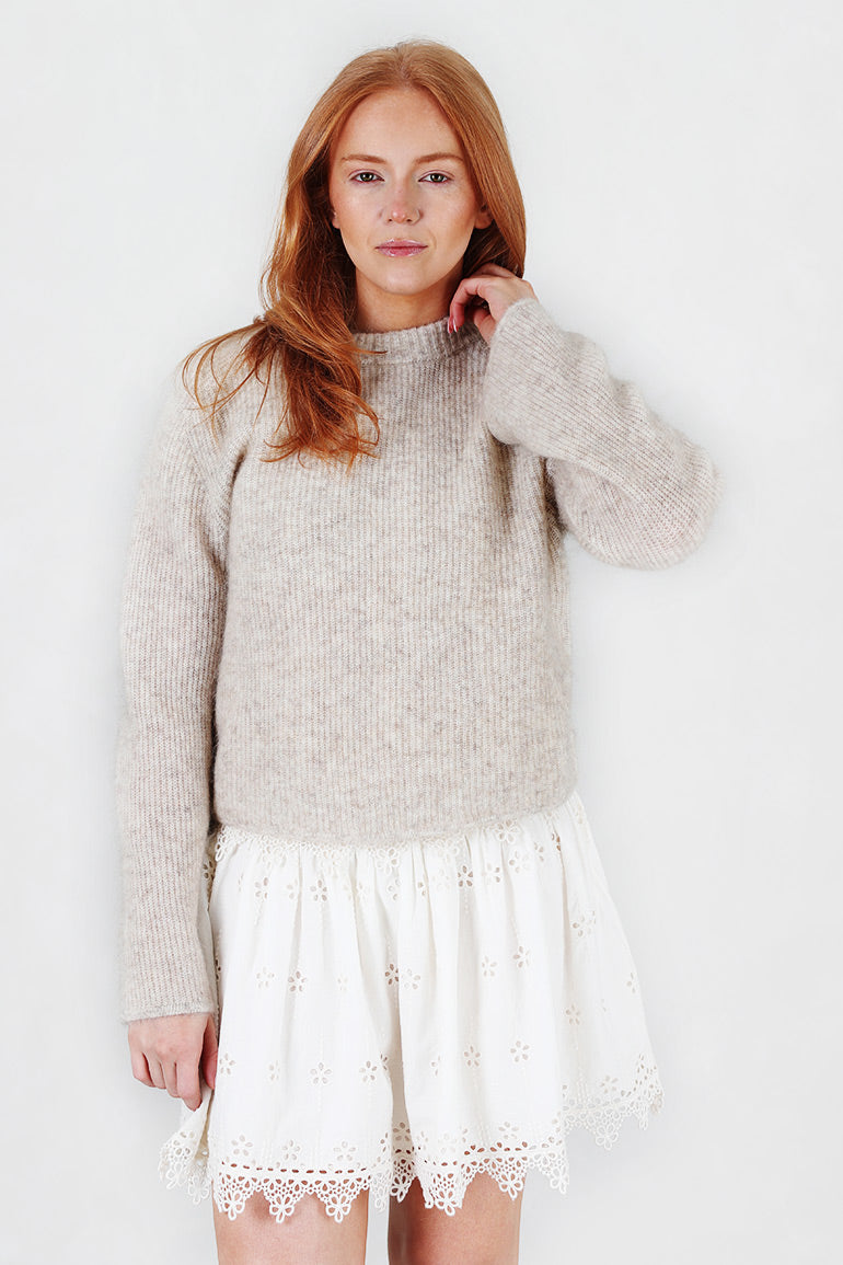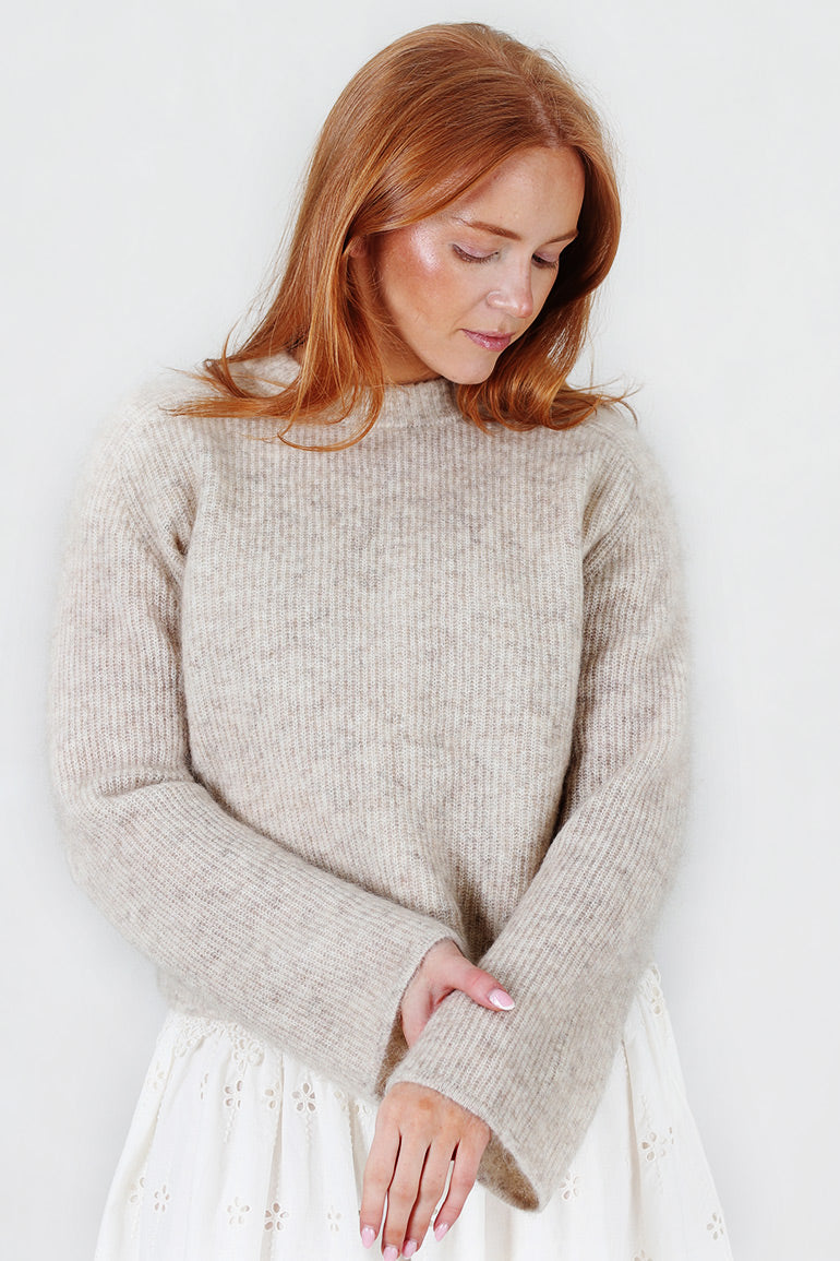 Nydelig, myk og deilig genser fra Christian Aks. Vakker beigemelert farge. Rund hals, lange ermer som går litt forsiktig ut. Ribbestrikk.