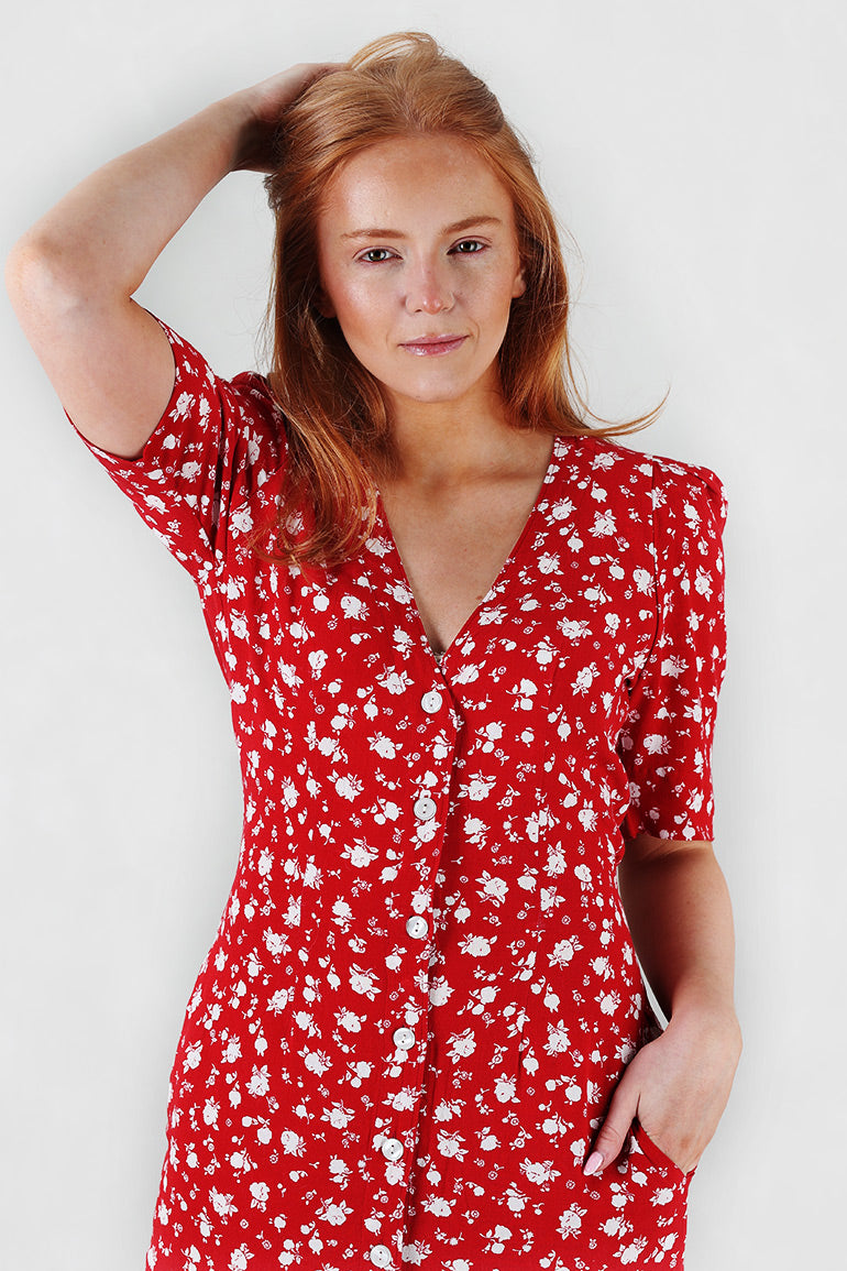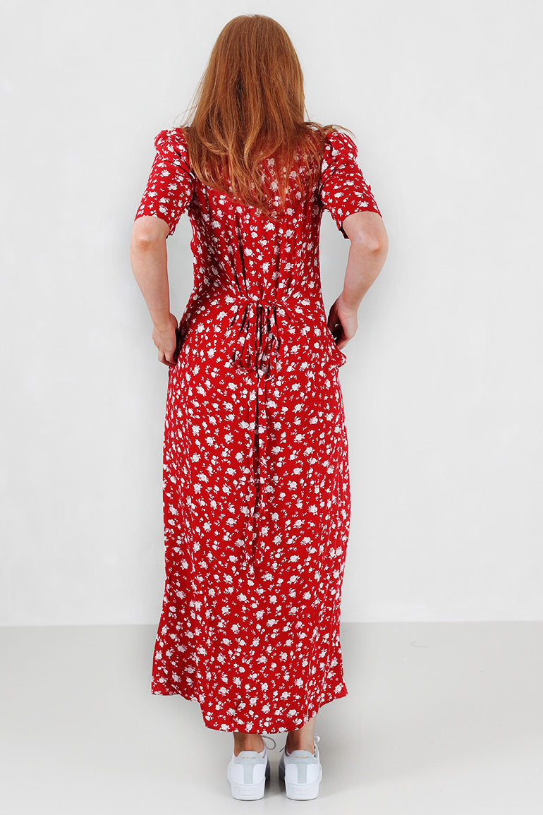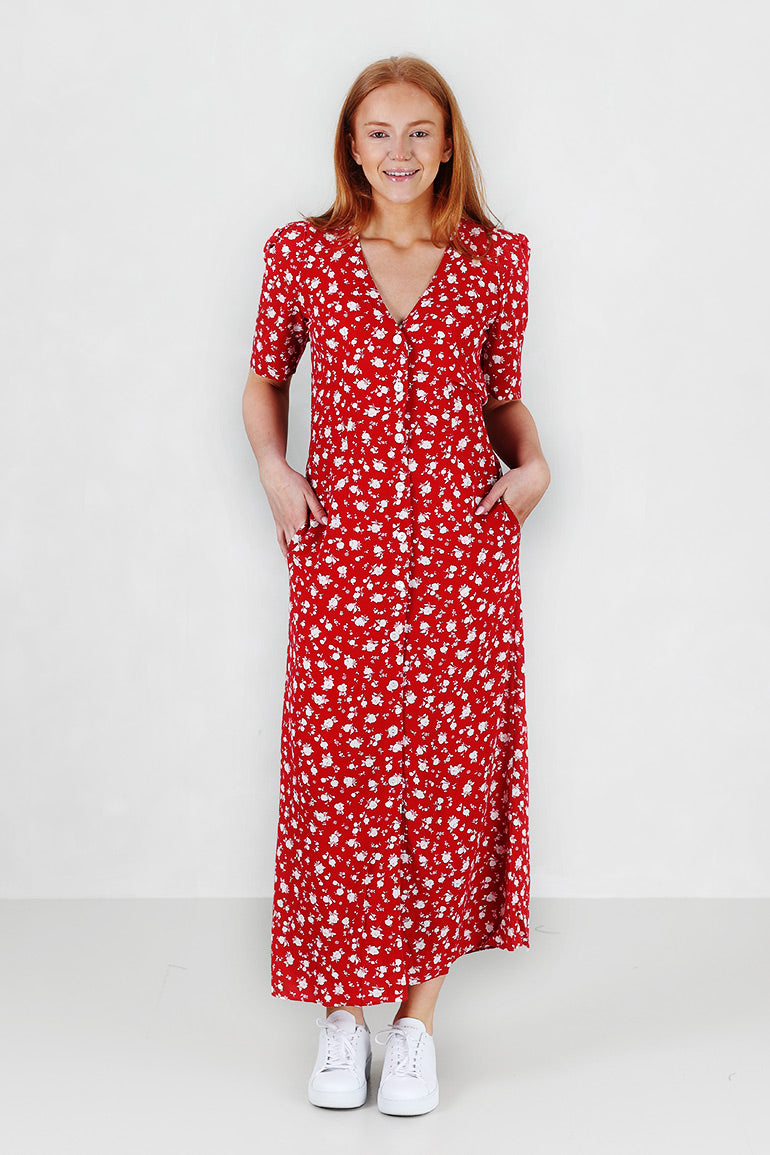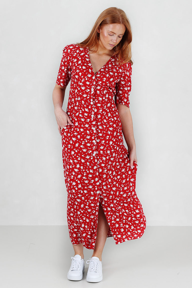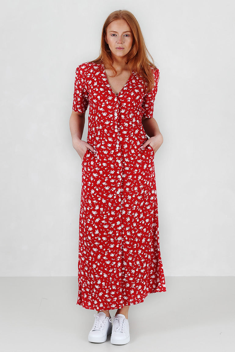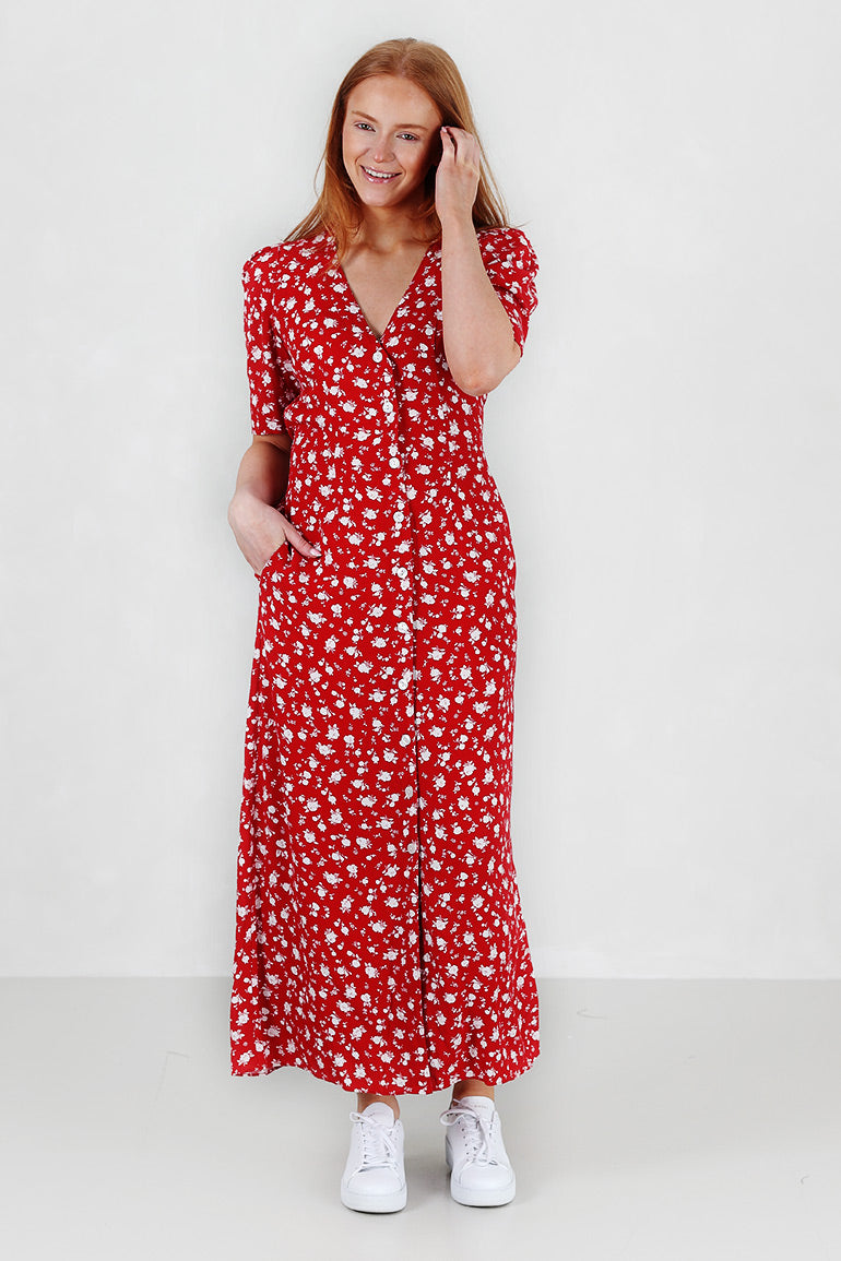 Utrolig flott kjole fra Pia Tjelta som er like fin til sneakers som til heler. Korte puffermer, v-hals, knapper helt ned, lommer i sidene og knyting foran.