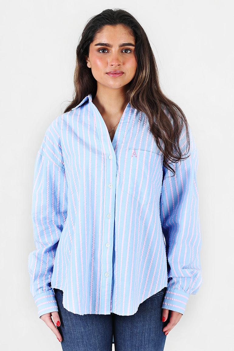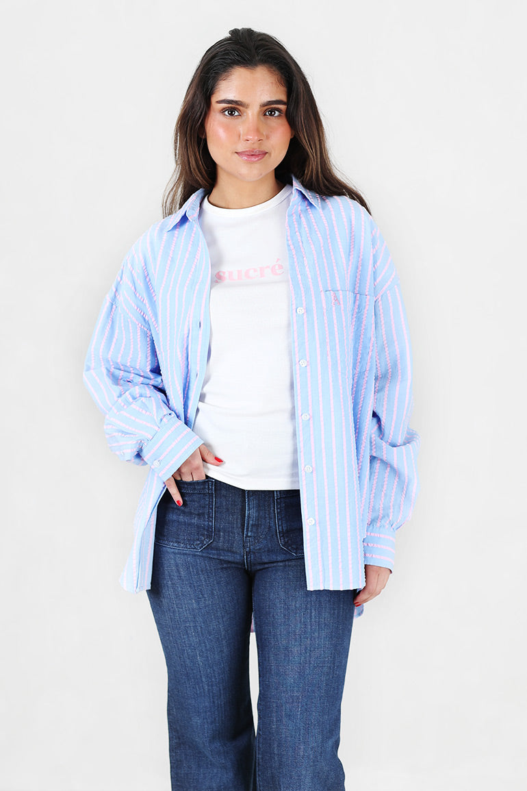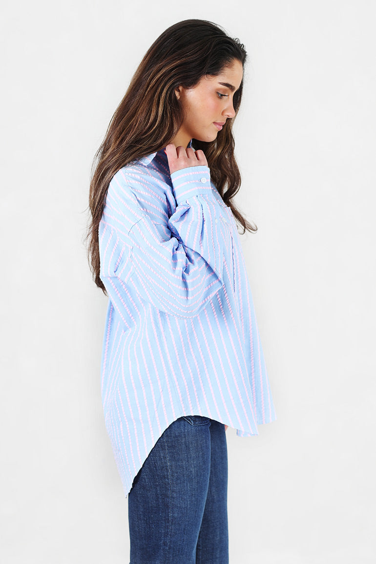 Utrolig skjønn oversized skjorte fra Arnie Says i lyseblå med lyserosa striper og seersucker kvalitet. Krage, knapper helt ned og ekstra lengde bak.
