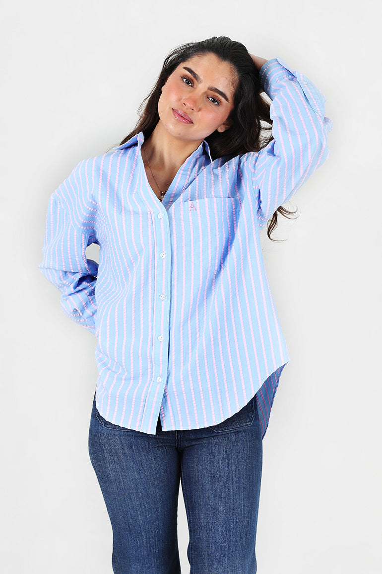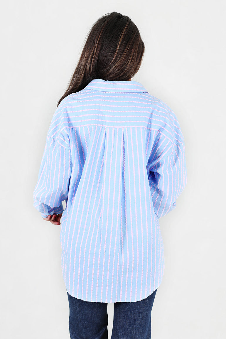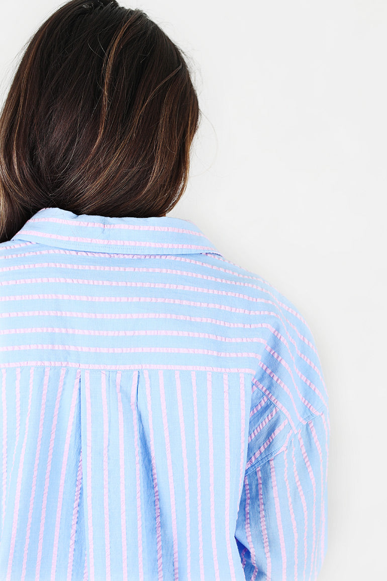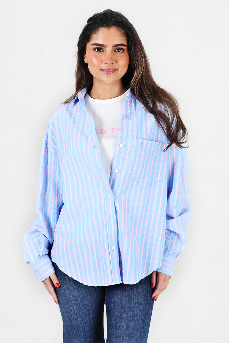 Utrolig skjønn oversized skjorte fra Arnie Says i lyseblå med lyserosa striper og seersucker kvalitet. Krage, knapper helt ned og ekstra lengde bak.