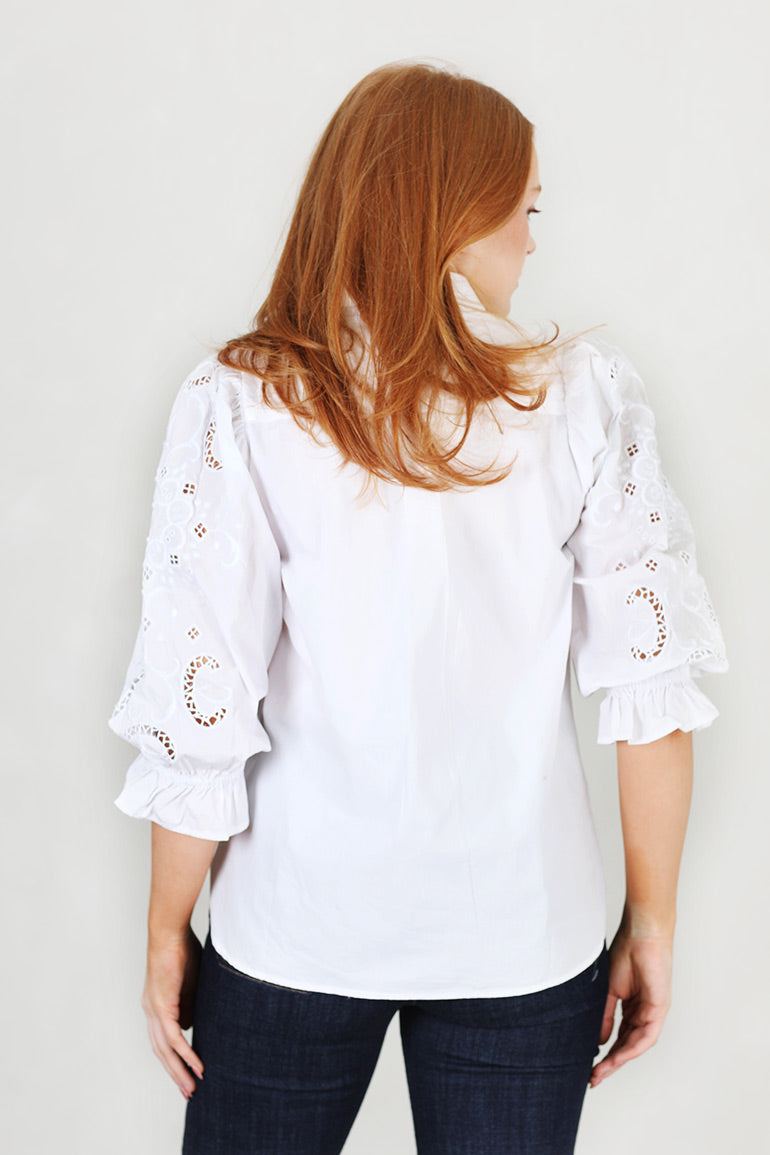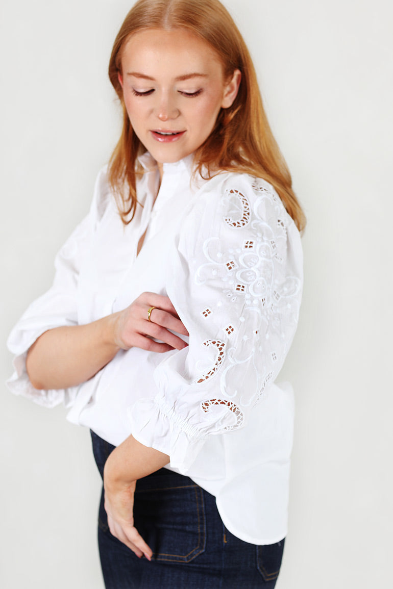 En nydelig variant av den alltid så populære Amy skjorten fra Missmaya! Vi elsker denne modellen med vakkert blondemønster i ermene. Krage, skjult knappestolpe helt ned og 3/4 lange ermer med strikk. Små, forsiktige puffermer.
