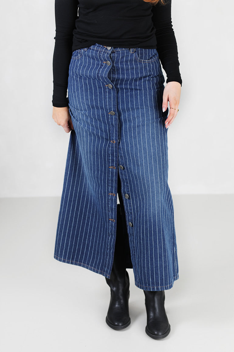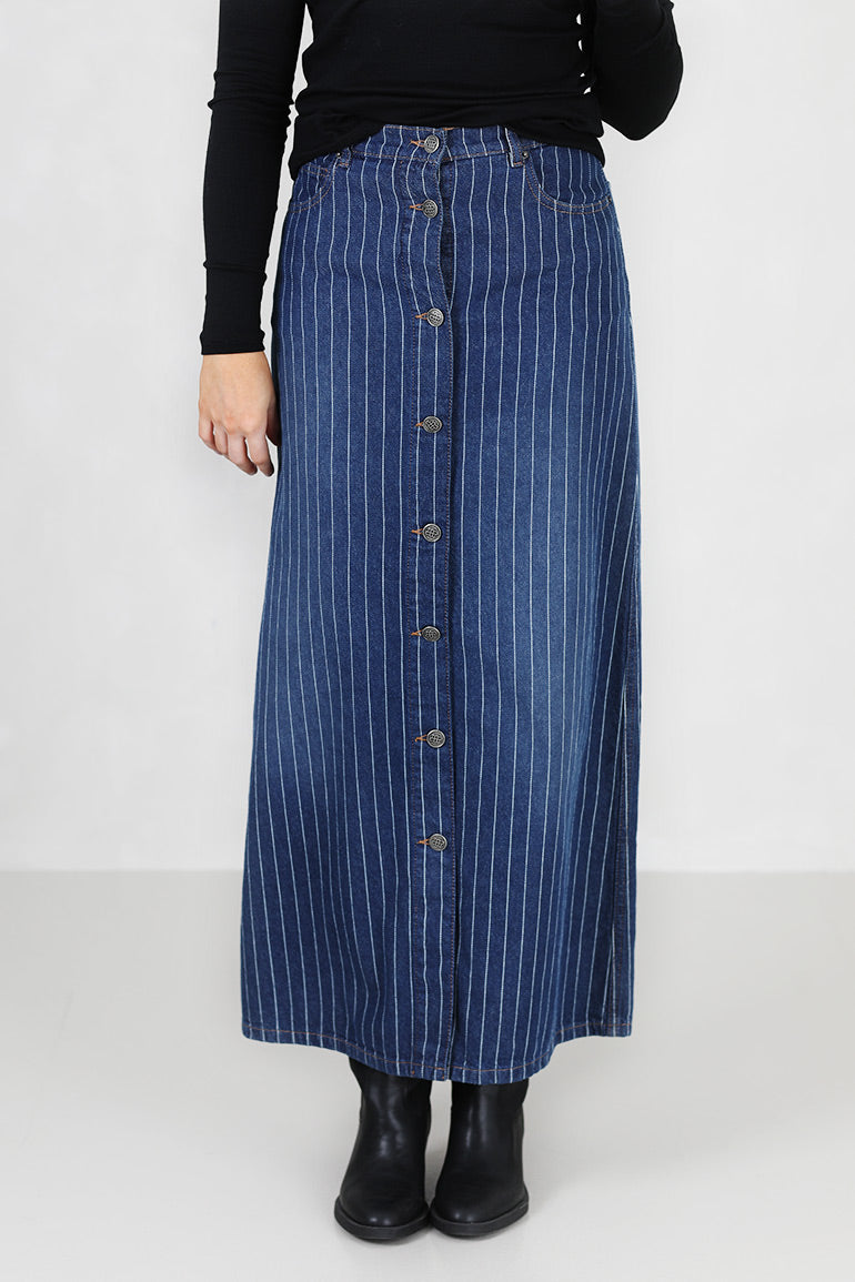 Denim maxi skjørt fra danske Munthe med knpper helt ned. Lommer i sidene og bak.Deilig og myk kvalitet.