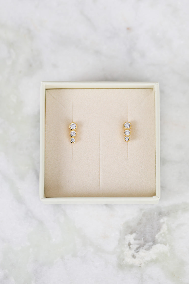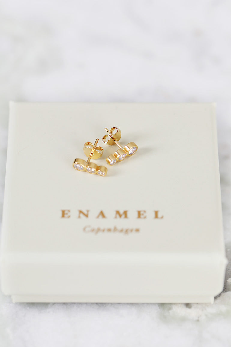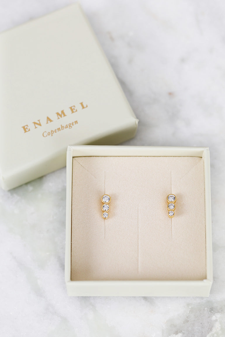 Trinity CZ studs fra ENAMEL Copenhagen er et par elegante gulløreringer, perfekt for en subtil, smakfull festantrekk. Tre rørsokler, i forskjellige størrelser, hver med sin gnistrende zirkon, skaper dette stilfulle designet. Hvis du leter etter et par små øredobber som kan brukes både til hverdags og fest, er Trinity CZ studs det perfekte valget.