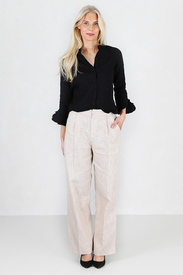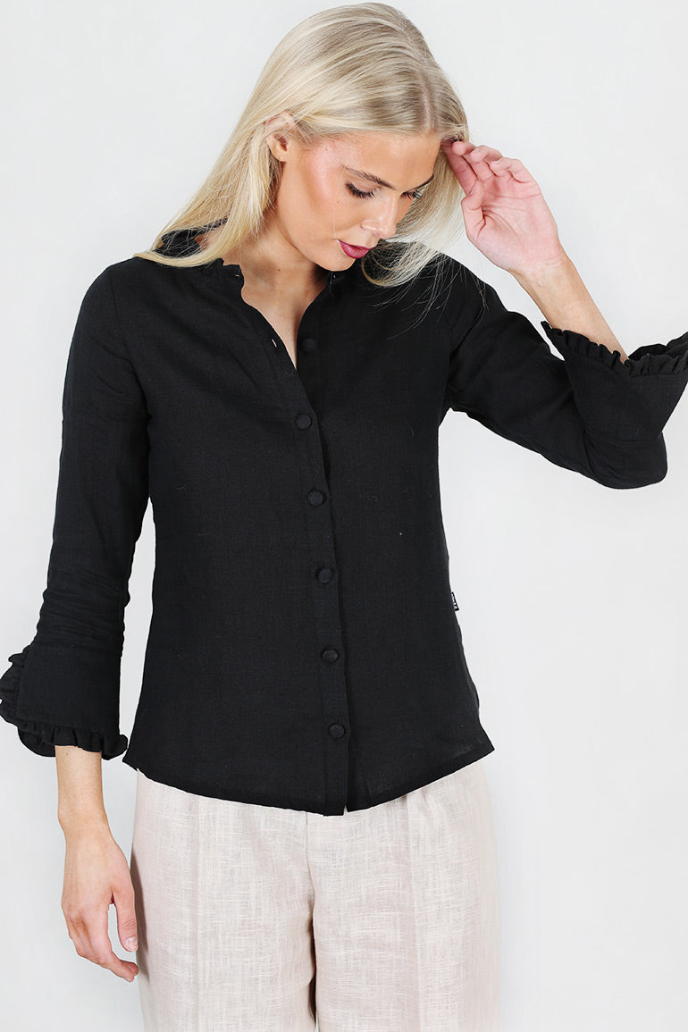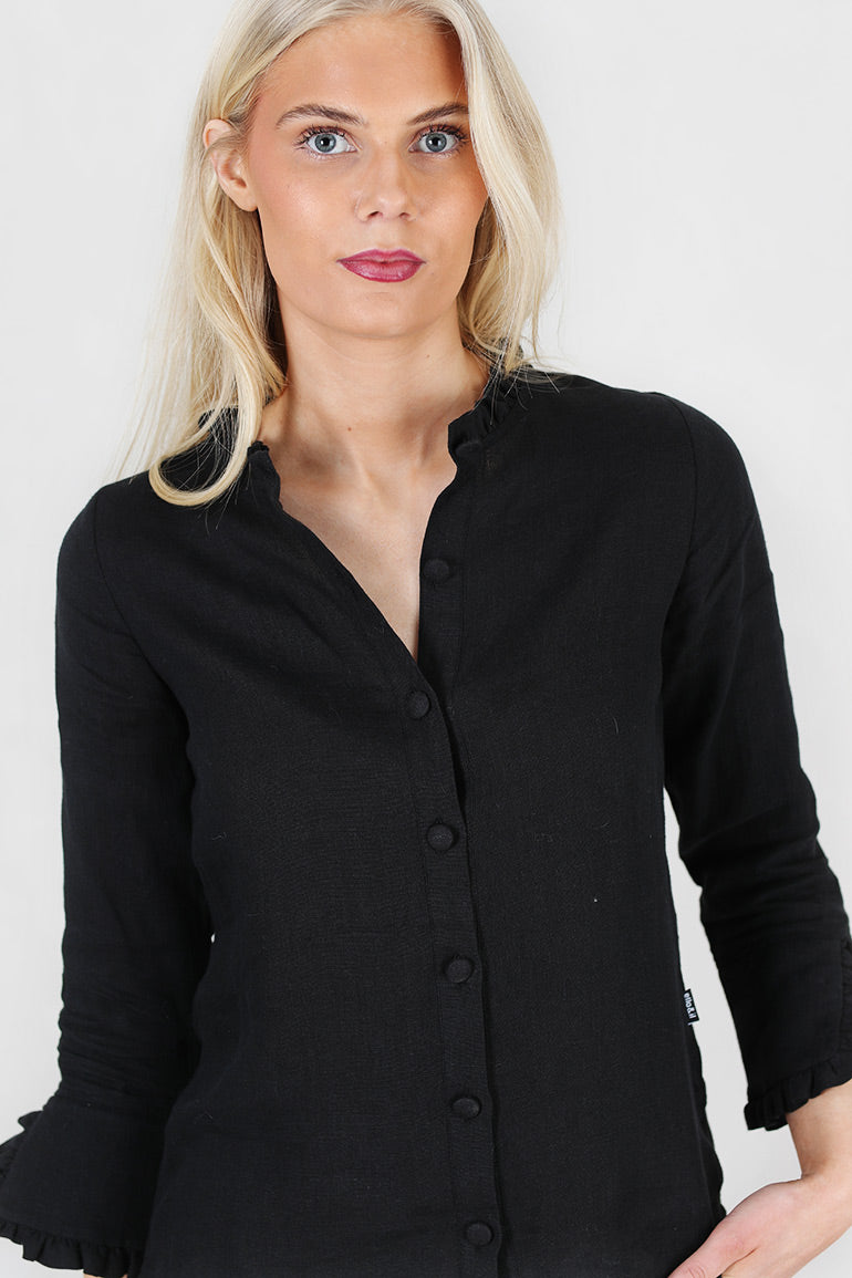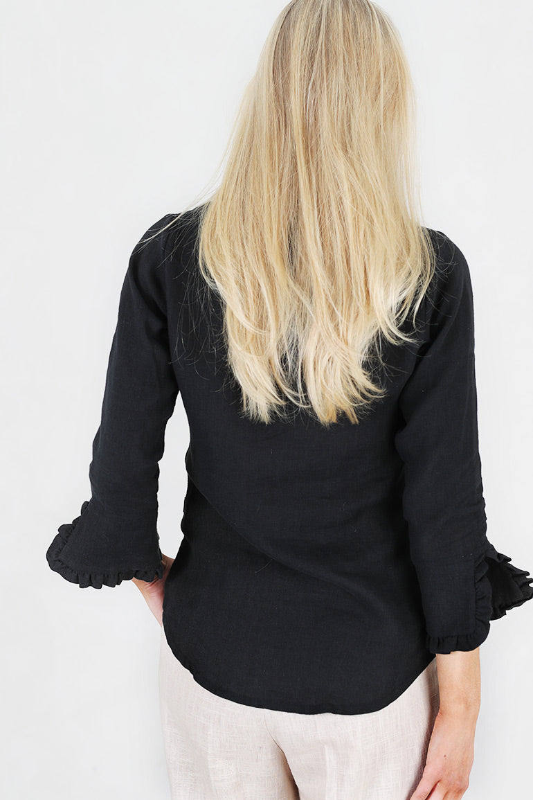 Fin skjorte i lin fra norske Ella & il. 3/4 lange ermer med splitt og volanger. Lenger bak enn foran. Liten krage med volanger i halsen og knapper helt ned.