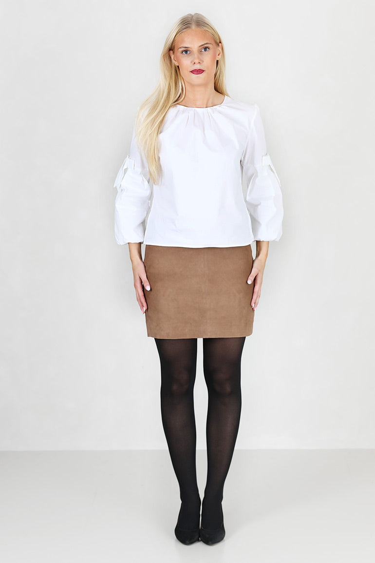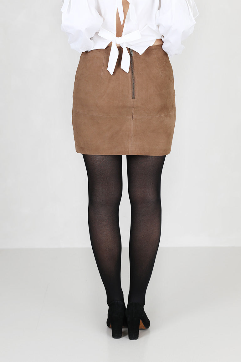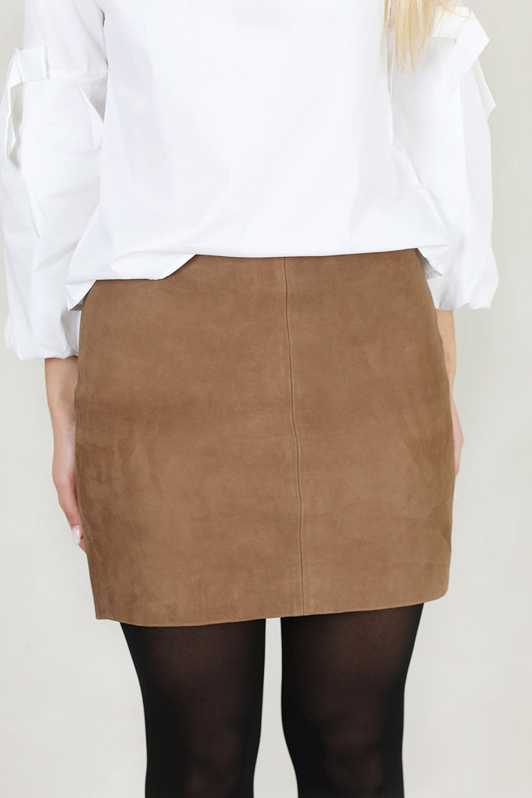 Kort, semsket skjørt fra danske My essential wardrobe i den perfekte congac fargen. Lukkes med glidelås bak.