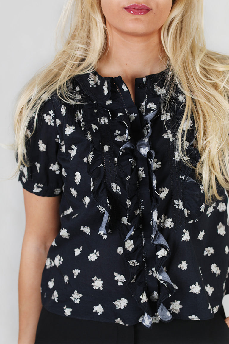 Skjønn bluse med korte ermer fra Pia Tjelta. Rund hals med knapper helt ned, små puffermer og fine rysje detaljer foran.