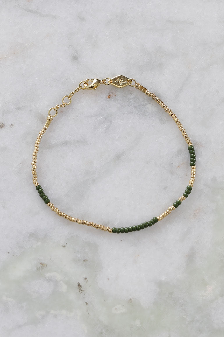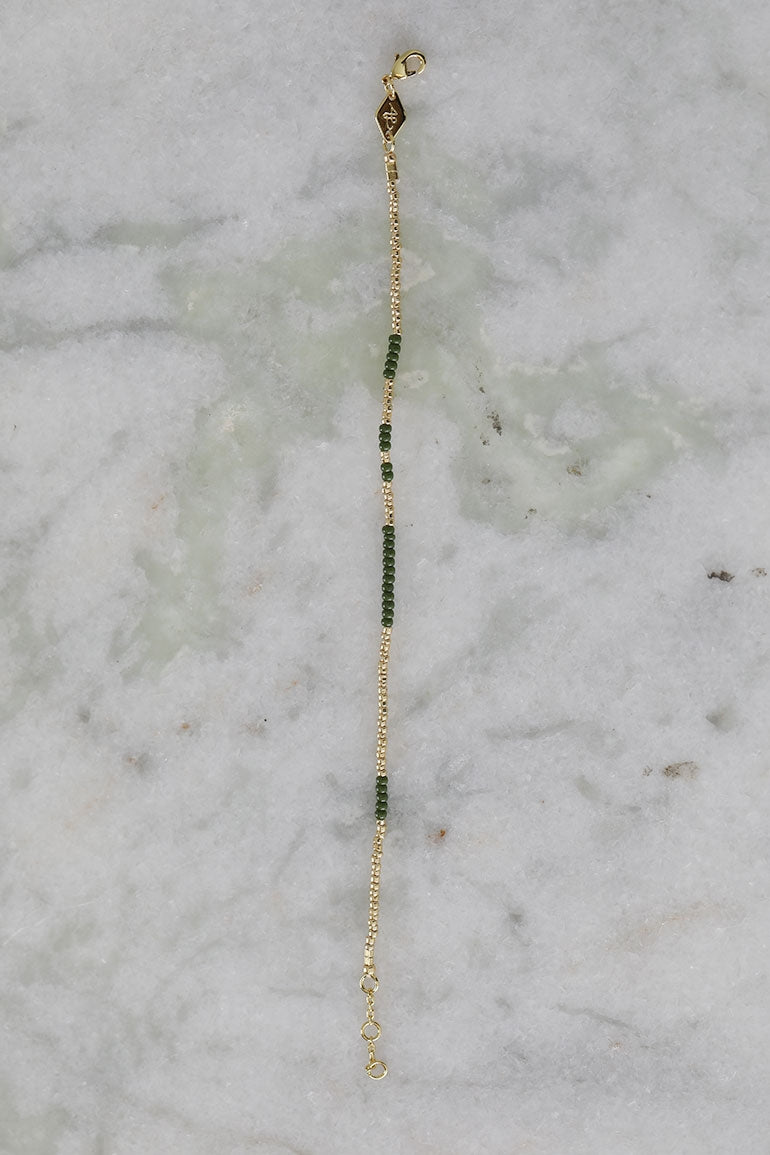 Lengde: 15,5-18 cm. "Bracelet with Seed Beads and Gold beads. Clasp and extender chain in Sterling Silver 925S with 18kt goldplating."