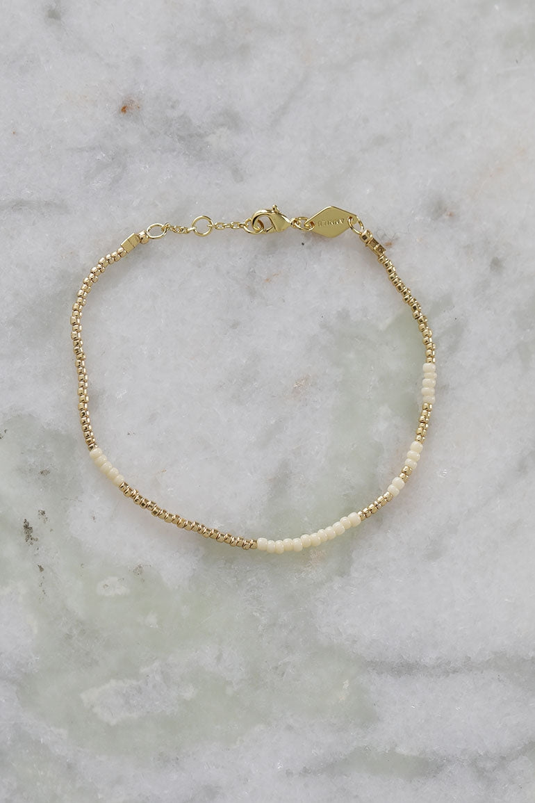 Vi elsker armbåndene til vår store smykkefavoritt Anni Lu! Superfine alene, men fantastiske sammen i ulike kombinasjoner. Gullkuler og asymetriske offwhite perler.