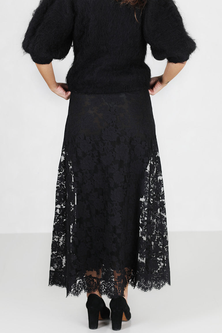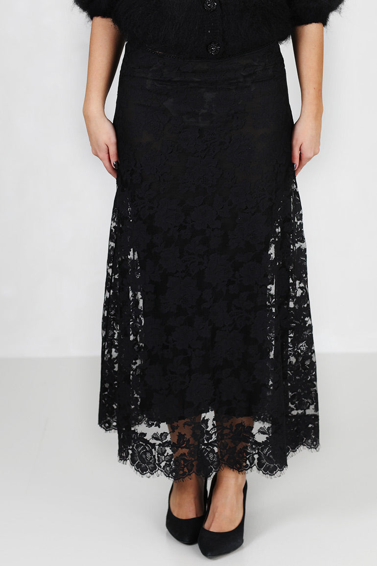 Vakkert blondeskjørt fra Pia Tjelte i sort med sort underskjort. Nydelige blonder, stikk i livet og ettersittende modell i midi lengde.