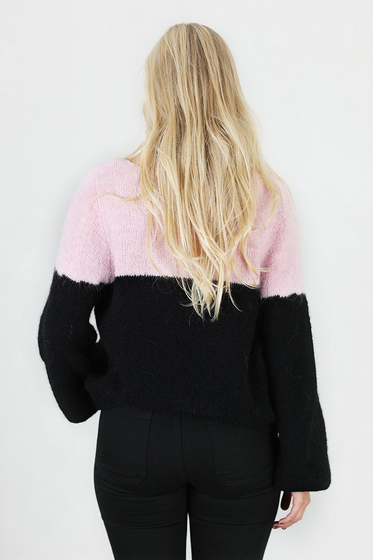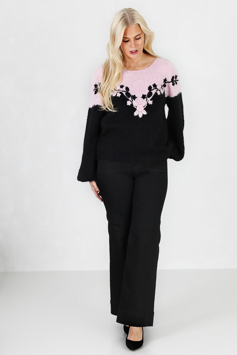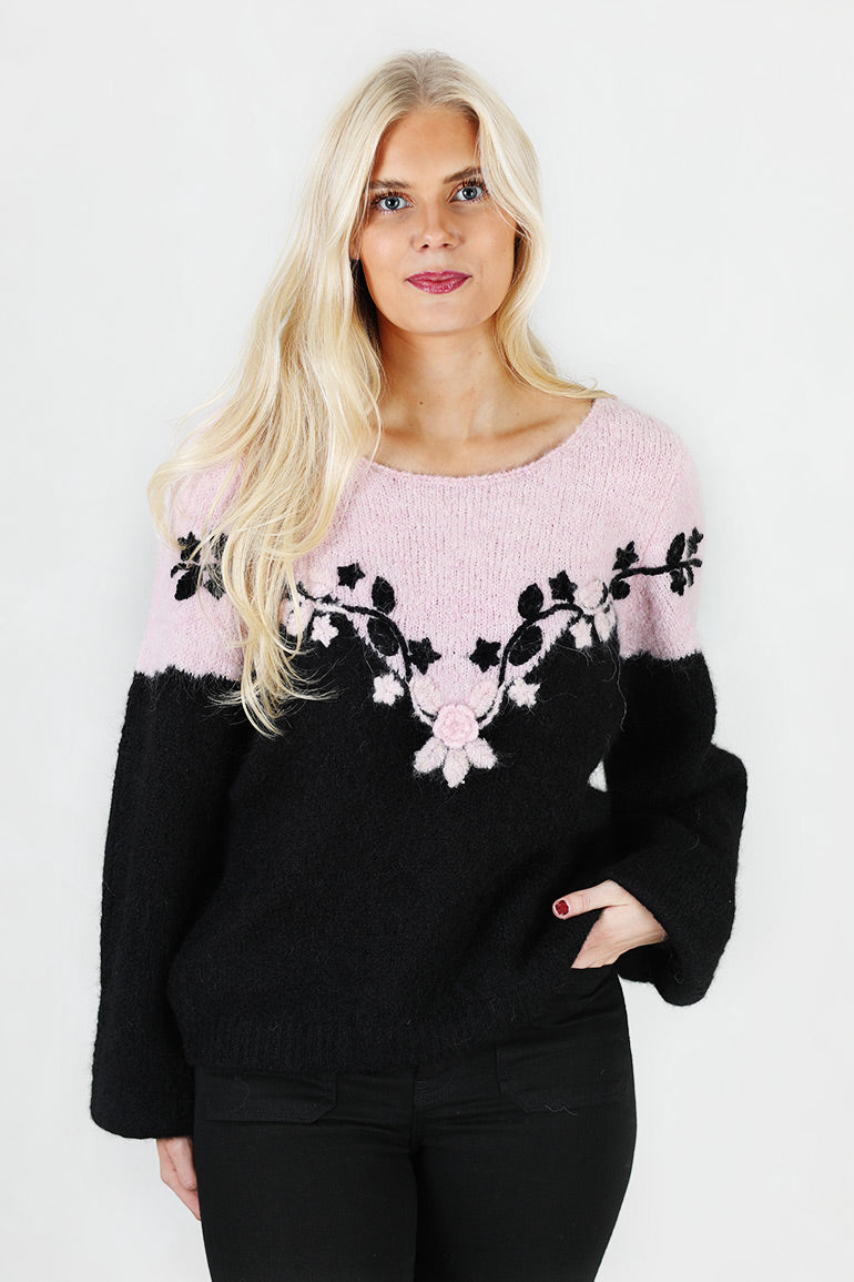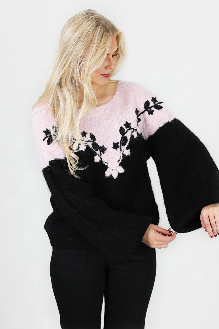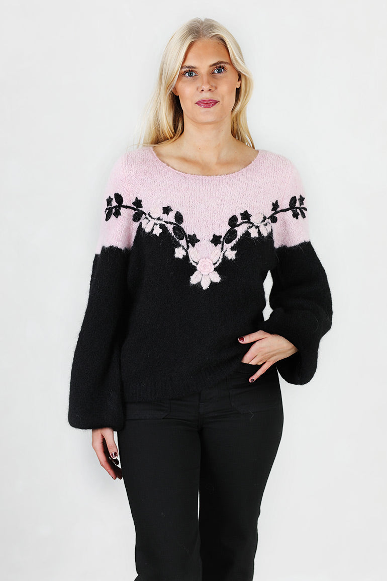 En helt utrolig nydelig genser fra byTiMo med sort bunn og rosa detaljer og mønster. Lange ermer som skrår litt ut, løs modell og løs rund hals.
