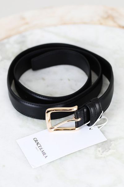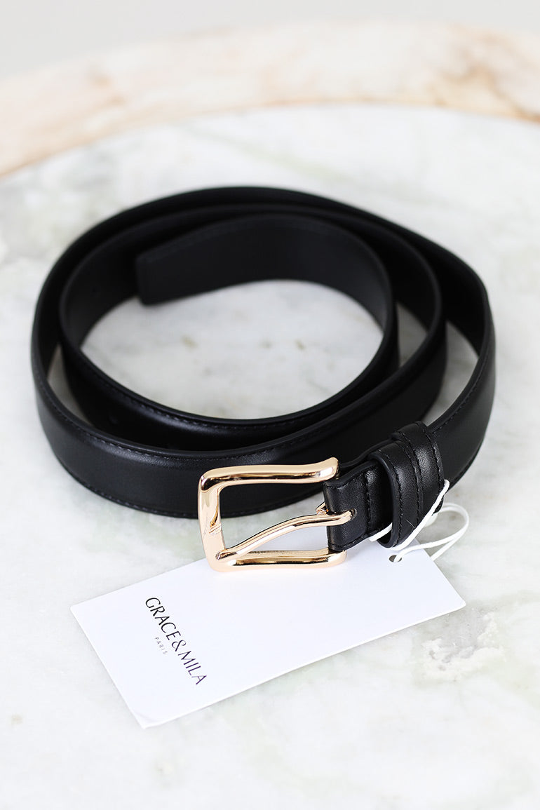 Superfint belte fra franske Grace & Mila. Beltene fra Grace & Mila har blitt helt vilt populære - og det skjønner vi godt. Det er det perfekte tilbhøret til antrekket. Sort med firkantet gullspenne.