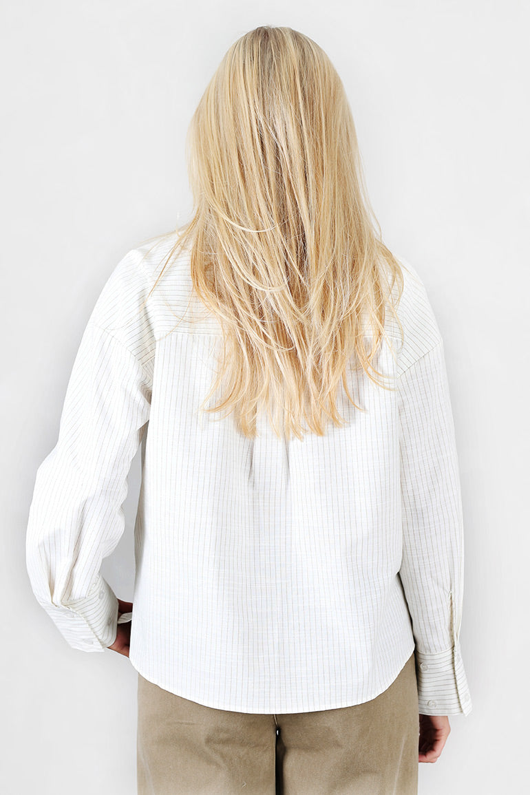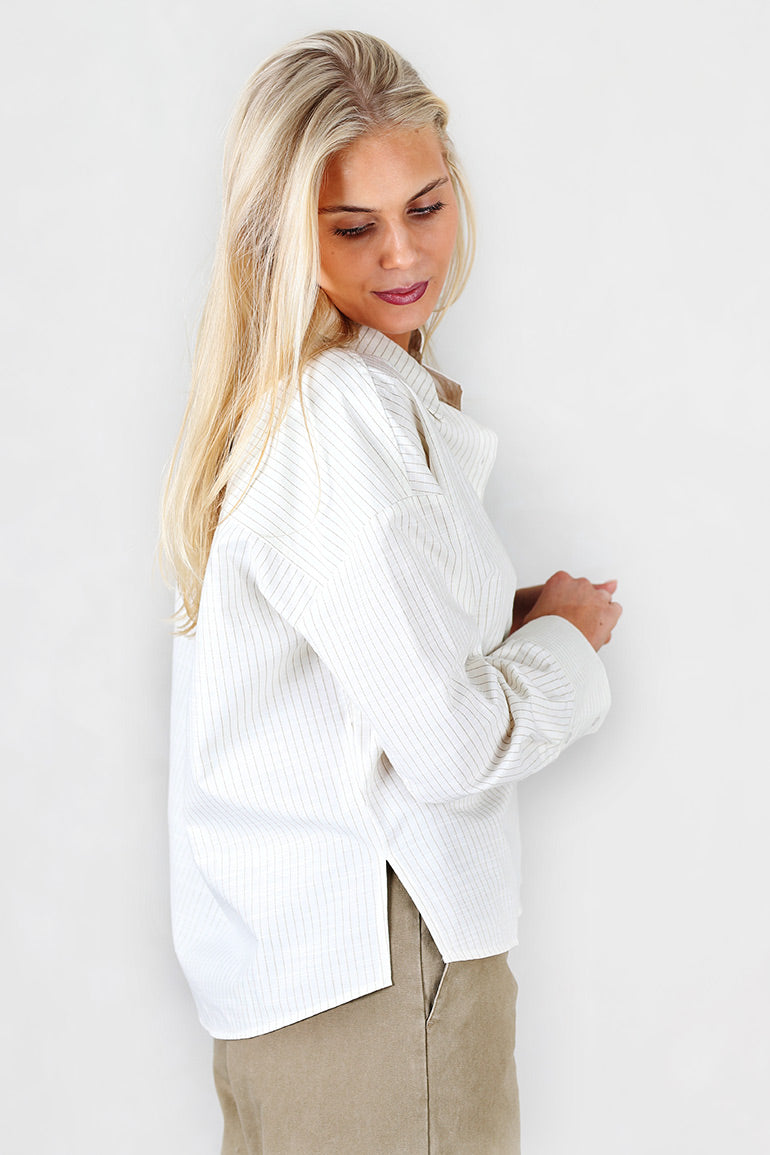 Deilig skjorte fra My essential Wardrobe med små striper. Krage, knapper helt ned og lange ermer med mansjett.