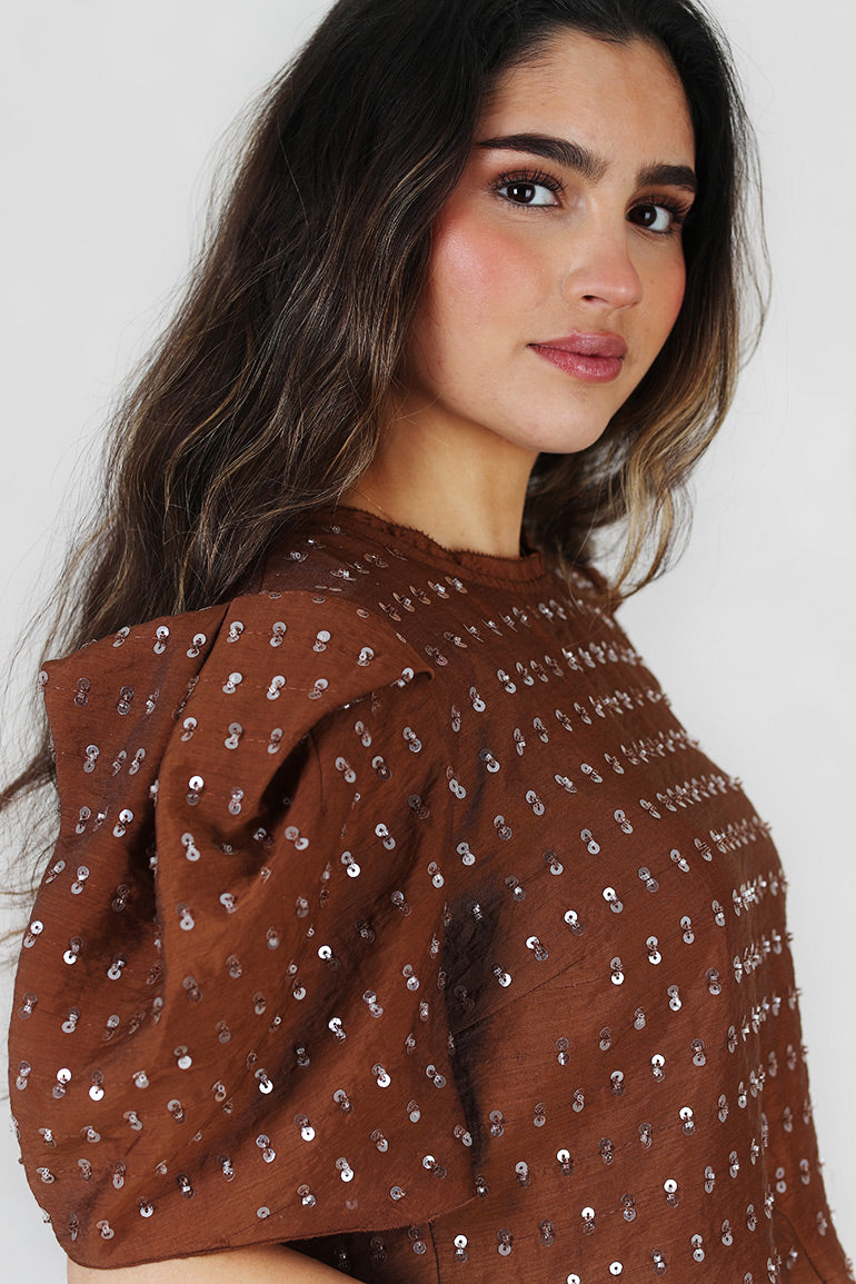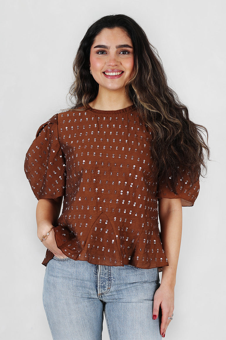 Nydelig bluse fra danske Munthe. Herlig brunfarge med sølvpaljetter. Rund hals, puffermer og innsvingt, men løs modell.