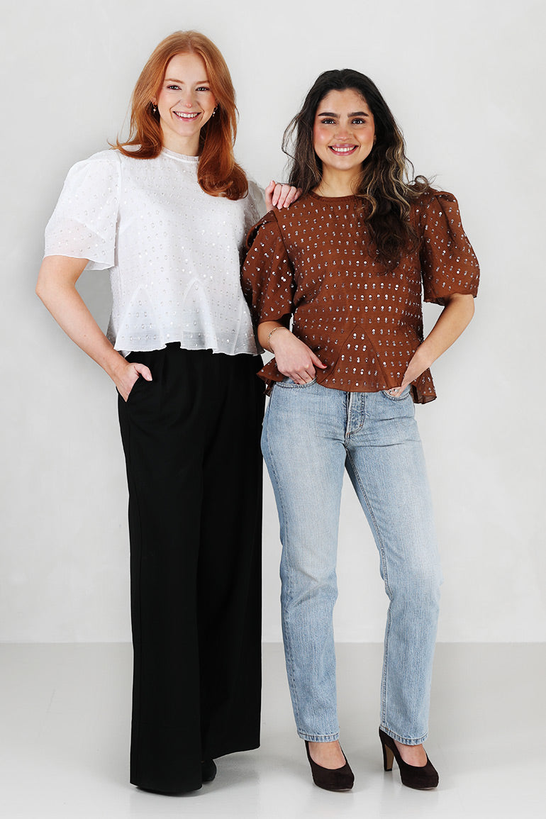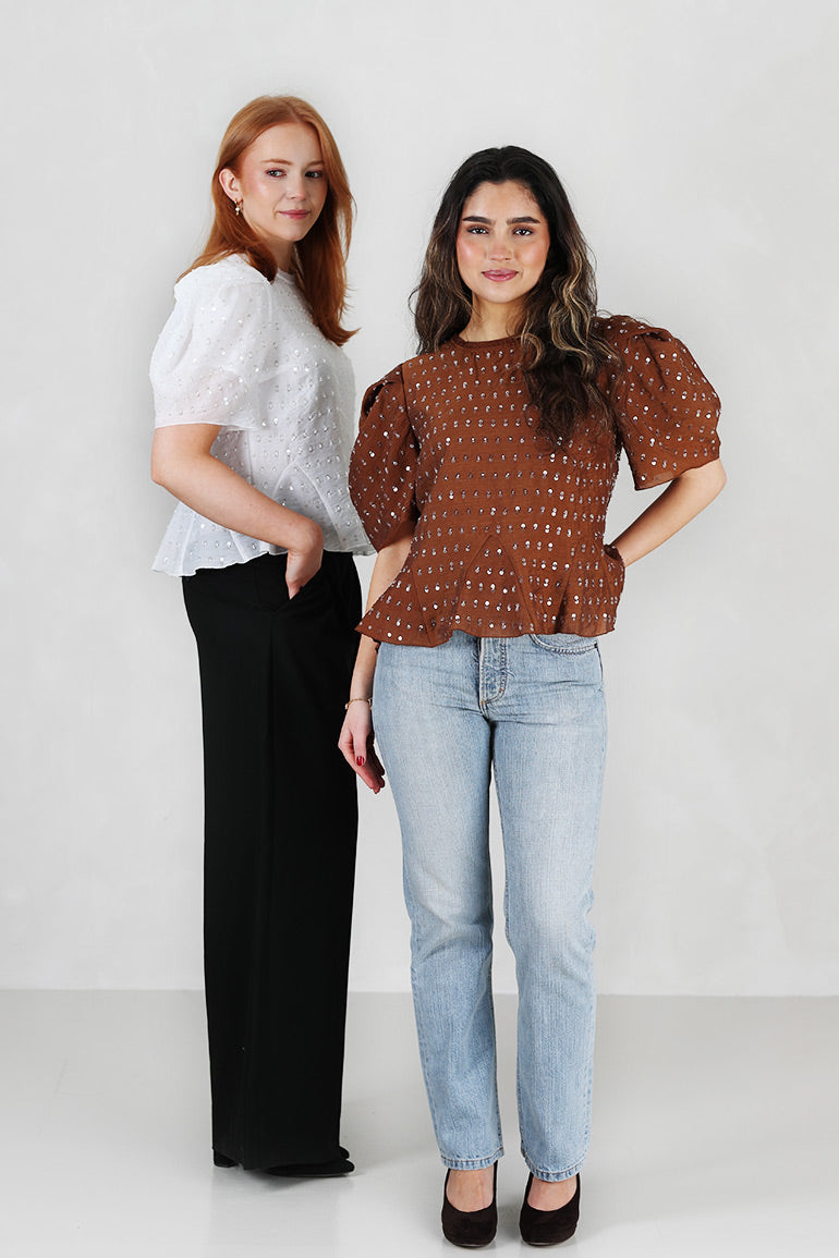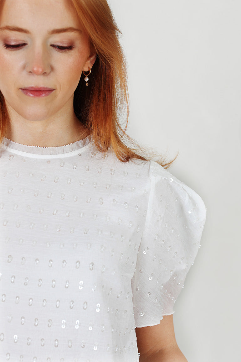 Nydelig bluse fra danske Munthe. Hvit bunn med sølvpaljetter. Rund hals, puffermer og innsvingt, men løs modell.