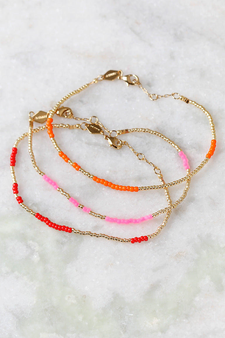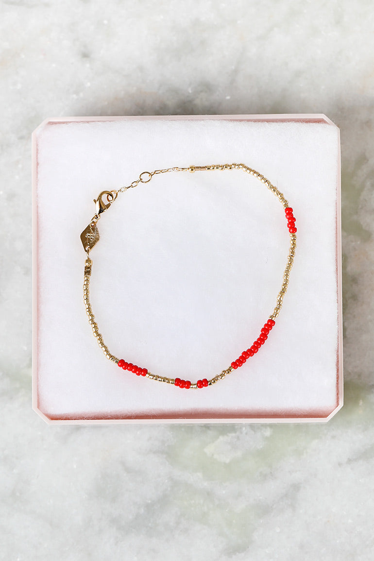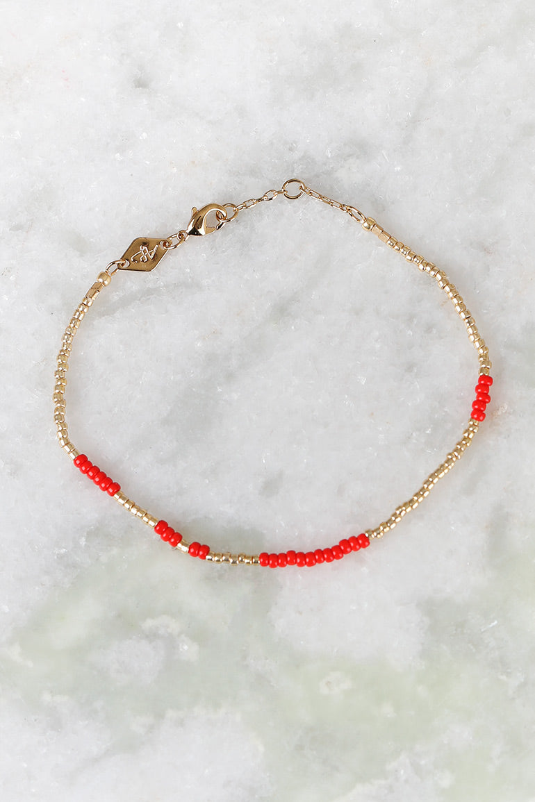 Vi elsker armbåndene til vår store smykkefavoritt Anni Lu! Superfine alene, men fantastiske sammen i ulike kombinasjoner. Gullkuler og asymetriske røde perler. Velg mellom mange fine farger.