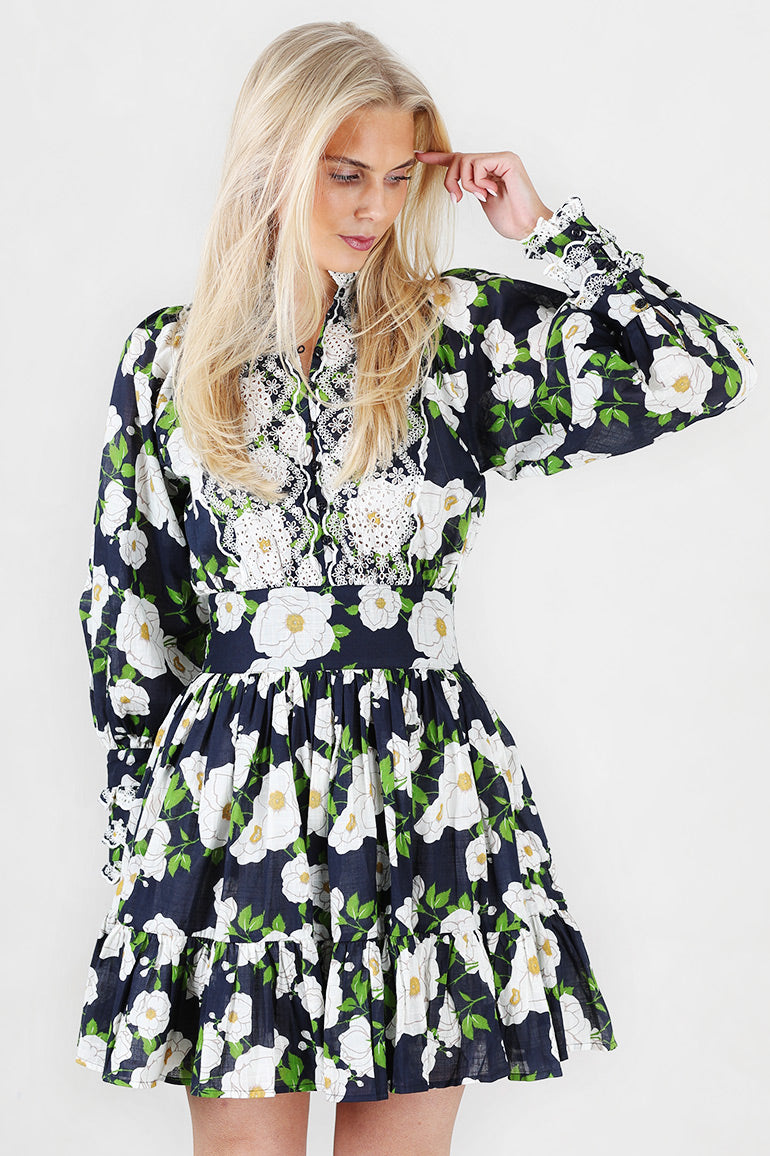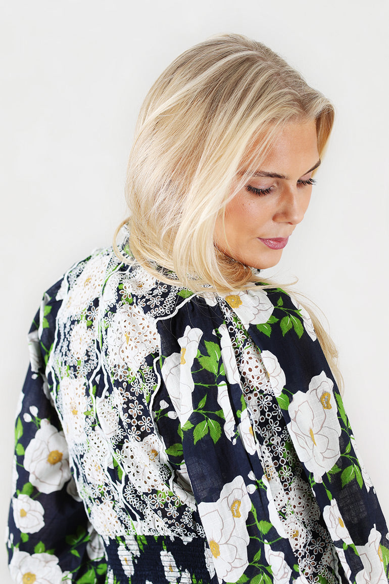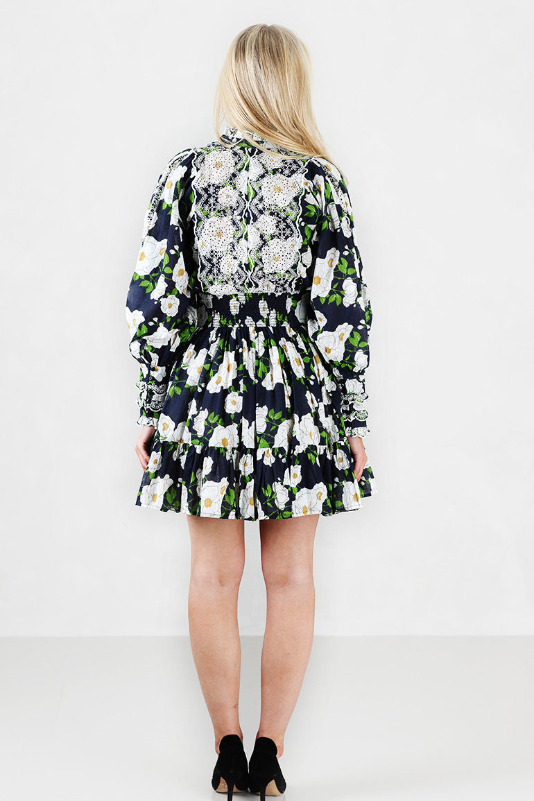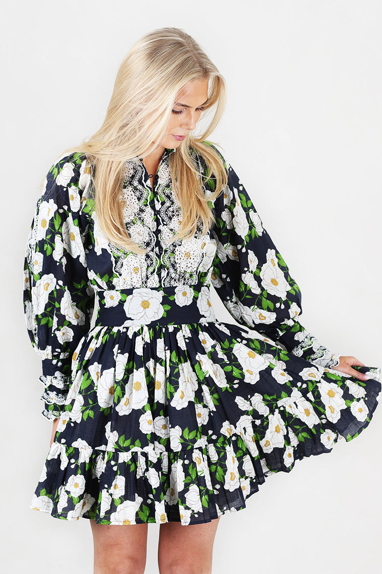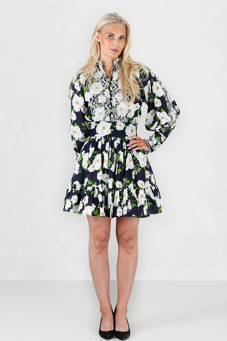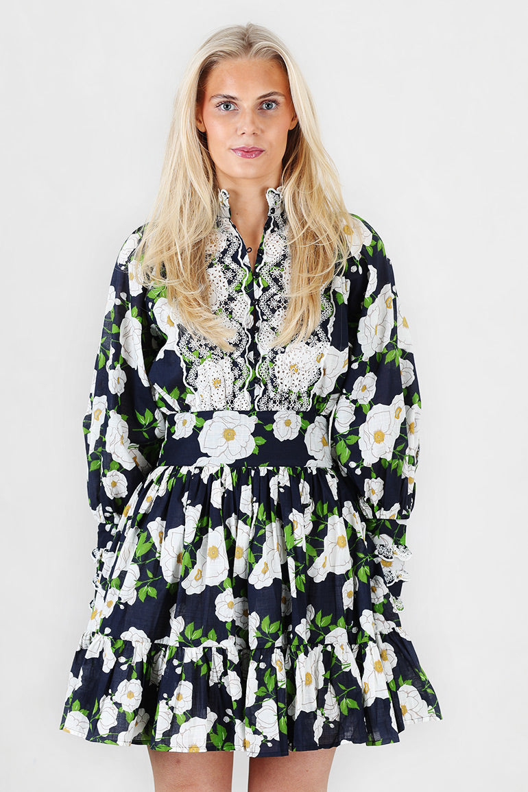 Favorittkjolen fra byTiMo i et vakkert blomsterprint med mørk blå bunn. Den nye Cotton slub mini dress har strikk i livet og de samme fine blondedetaljene i ryggen, over brystet og i ermene. Liten hals som kan åpnes med knapper ned brystpartiet. Glidelås i siden.
