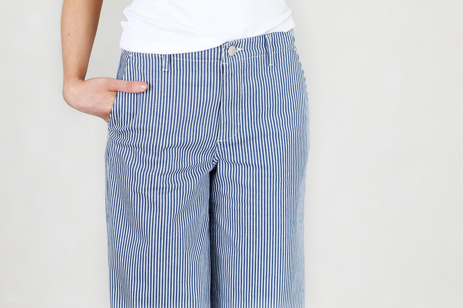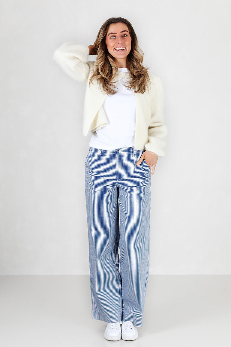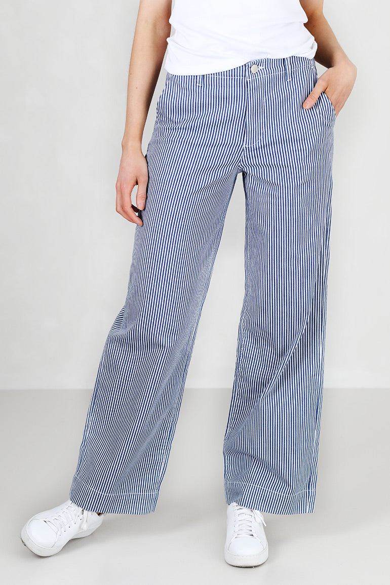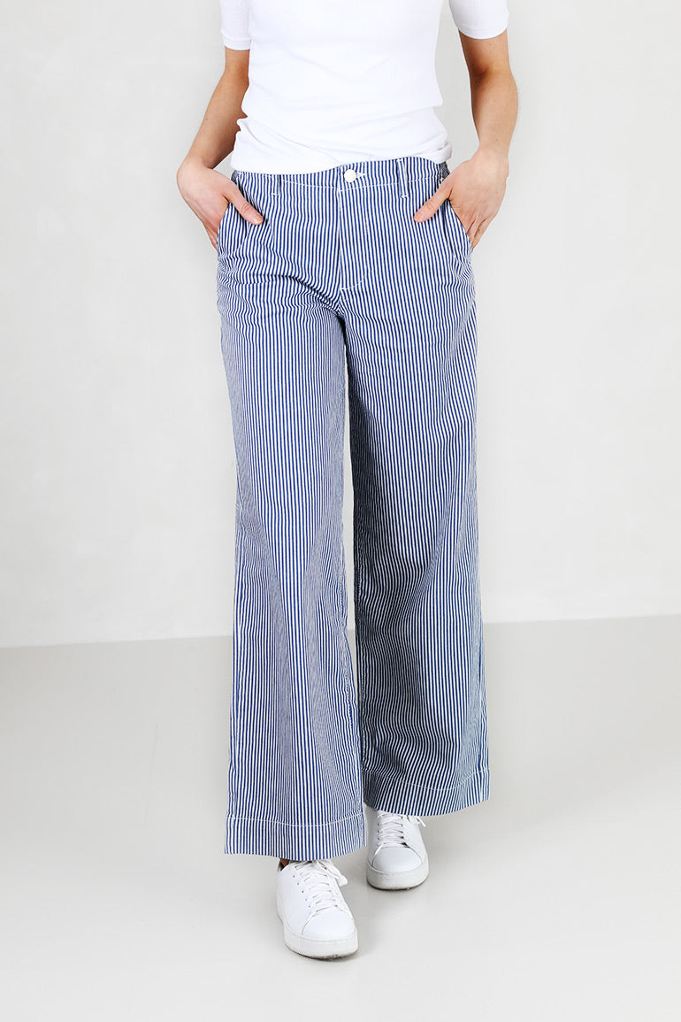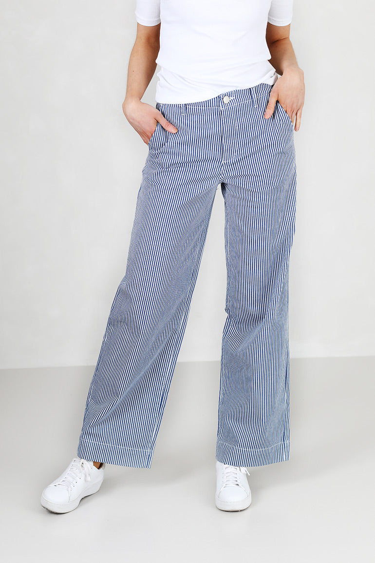Utrolig fin ny modell fra Five Units i deilig vårkvalitet og blå/hvite striper. Medium høy på livet, skrå lommer i sidene og løse ben. Fine baklommer.