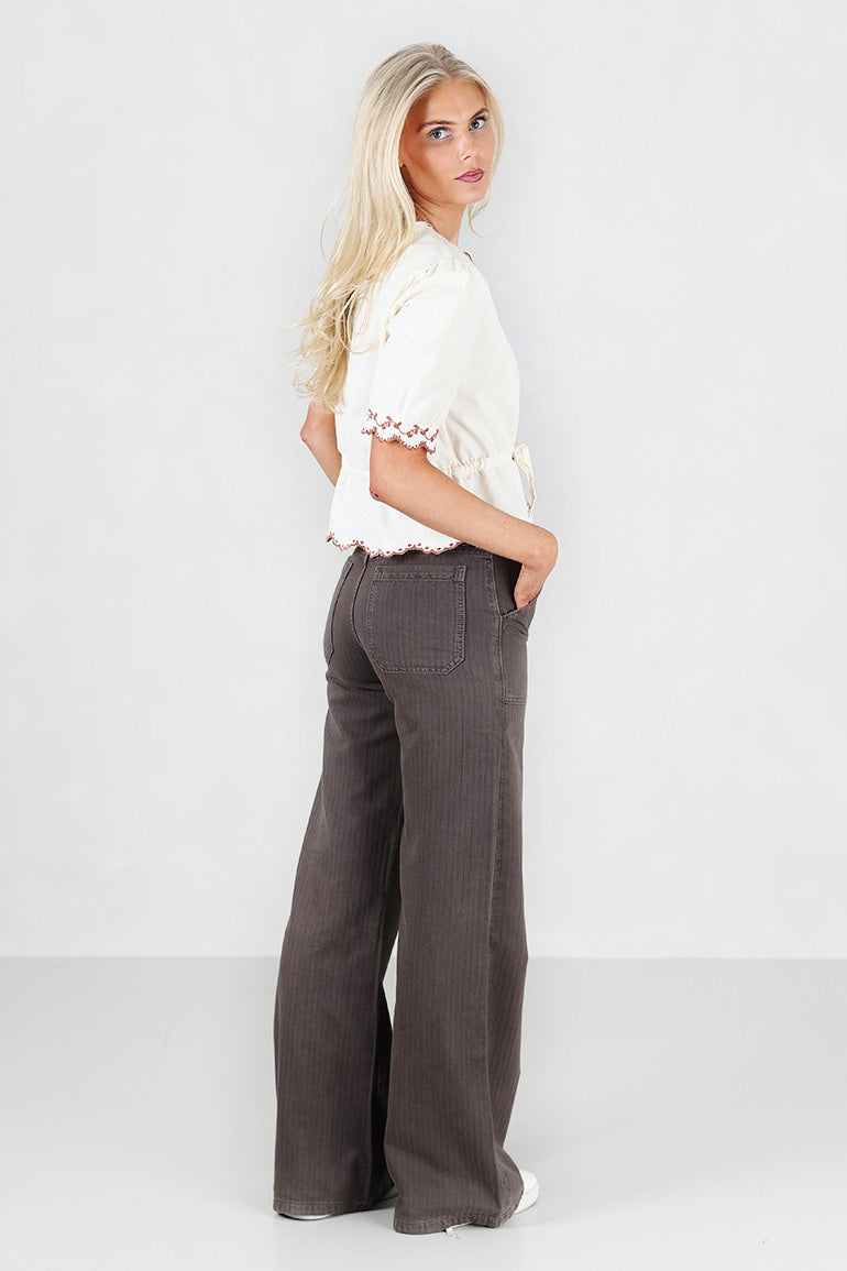 Nydelig bluse fra Pia Tjelta med korte ermer og vakre broderier. Hvit bunn med brunt mønster. Knyting i livet og perleknapper.