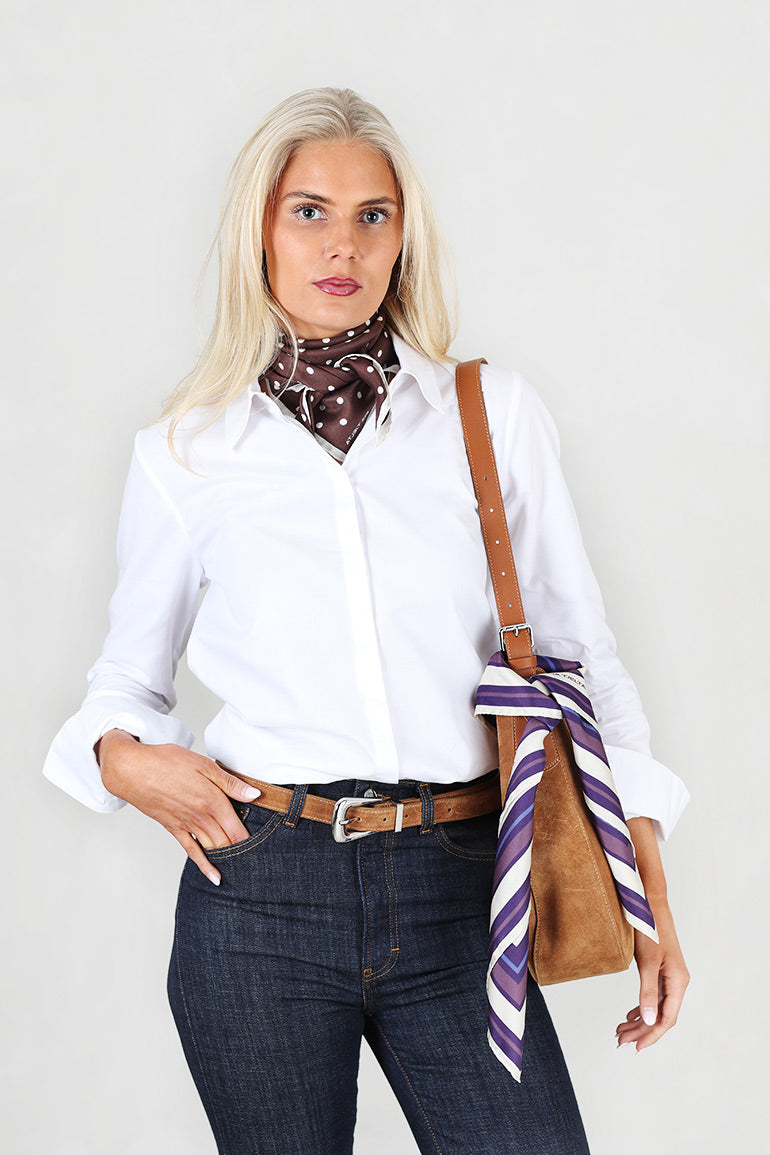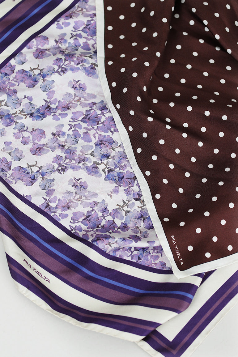 Nydelig silkeskjerf fra Pia Tjelta i lilla/hvit mønster. Superfint tilbhør som gjør prikken over ién på et hvert antrekk.