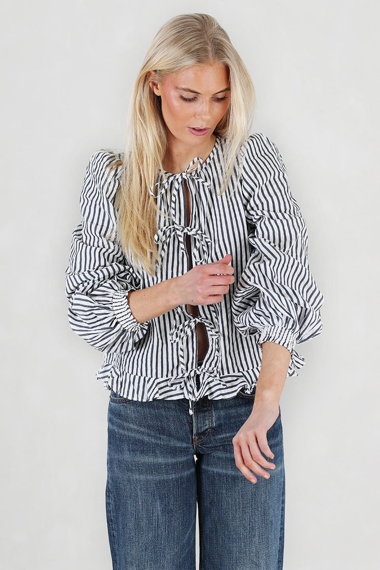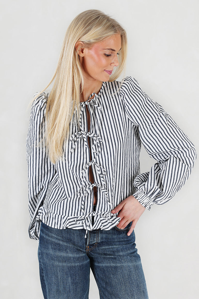 Fin bluse fra byTiMo med skjønne sløyfedetaljer og løs modell. Hvit bunn med blå striper. Deilig, sval krepp kvalitet.