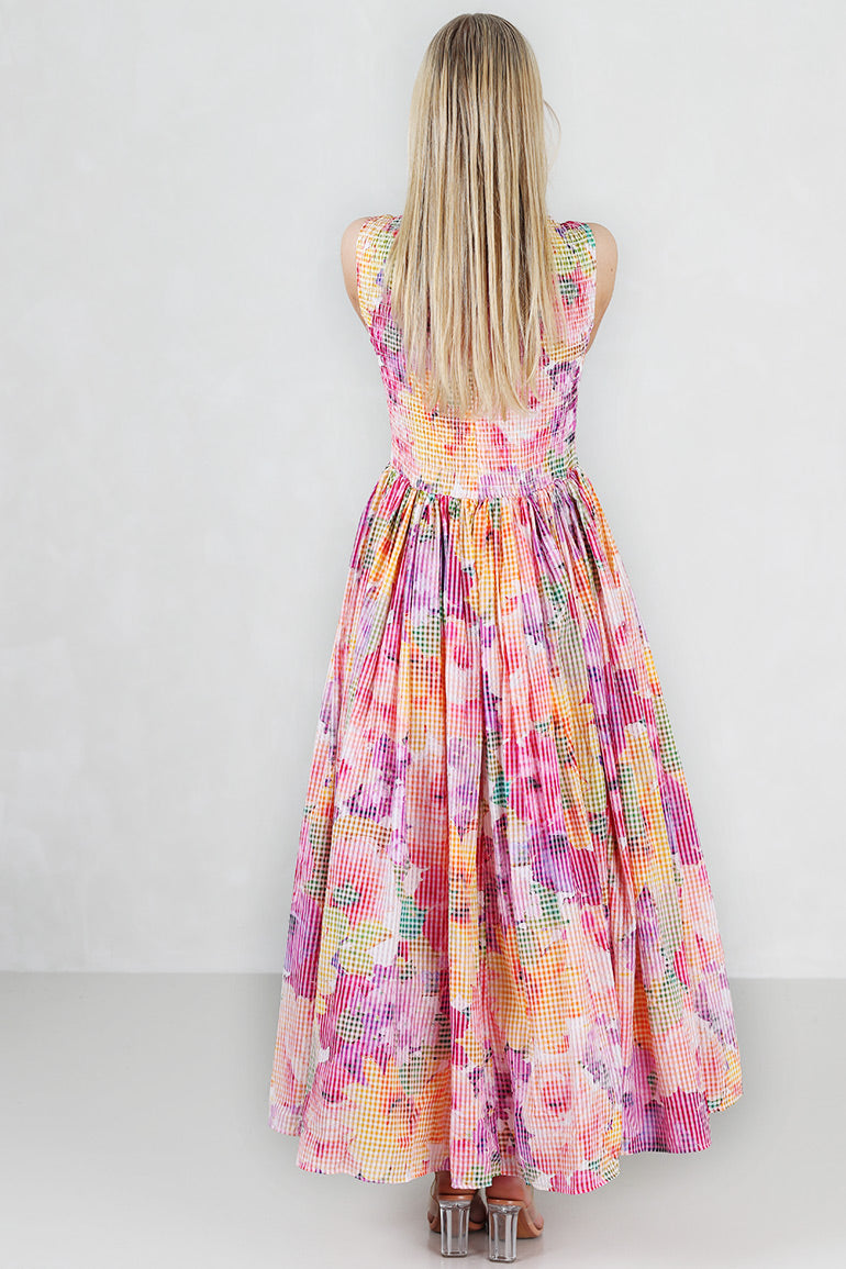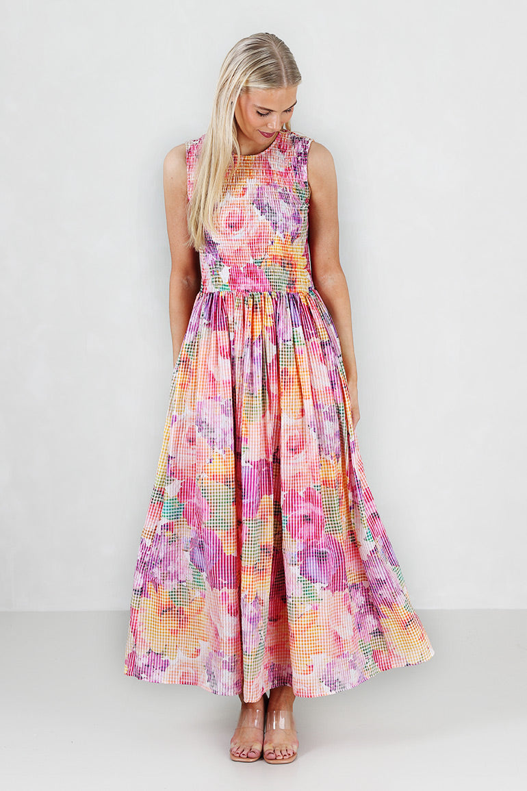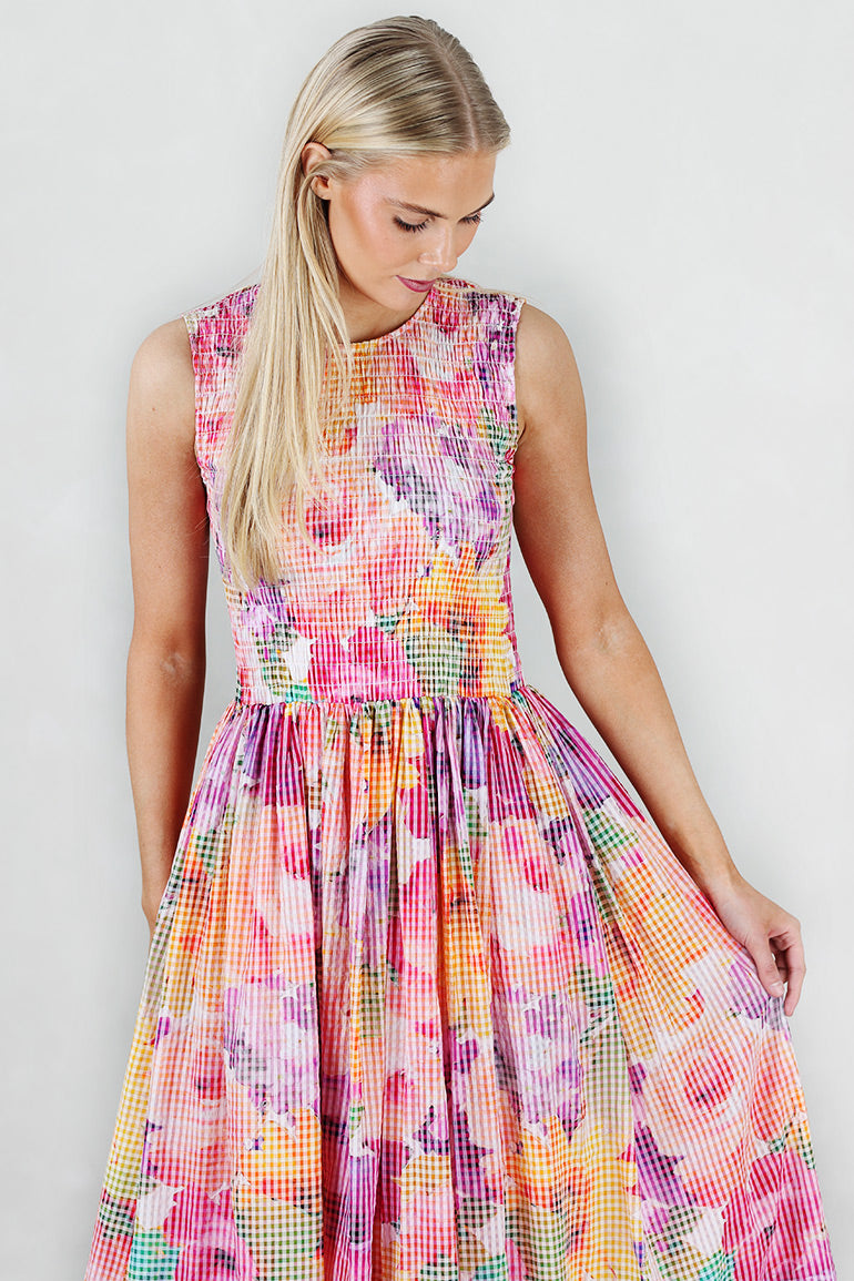 Ubeskrivelig vakker kjole fra byTiMo. Rund hals, brede stropper uten ermer og lommer i sidene. Vaffelmønster foran og bak. Full lengde. Elegant nok for bryllup, men også casual nok til å kunne bruke med sandaler eller småsko på en fin sommerdag. Akkurat det er byTiMo ekstremt gode på.